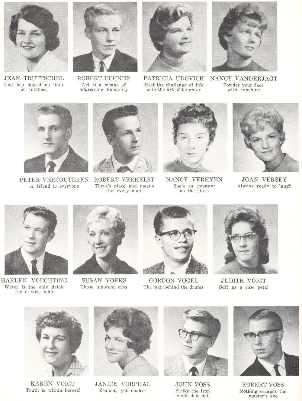 1961 Sheboygan South High School, Page 52: Jean Truttschel, Robert Uchner, Patricia Udovich, Nancy Vanderjagt, Peter Vercouteren, Robert Verhelst, Nancy Verhyen, Joan Versey, Harlen Voechting, Susan Voeks, Gordon Vogel, Judith Voigt, Karen Voigt, Janice Vorphal, John Voss, Robert Voss.