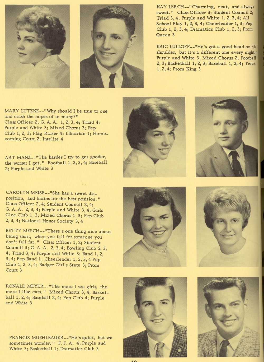 1962 Kiel High School, Page 10: Kay Lerch, Eric Lulloff, Mary Lutzke, Art Manz, Carolyn Meise, Betty Mesch, Ronald Meyer, Francis Muehlbauer.