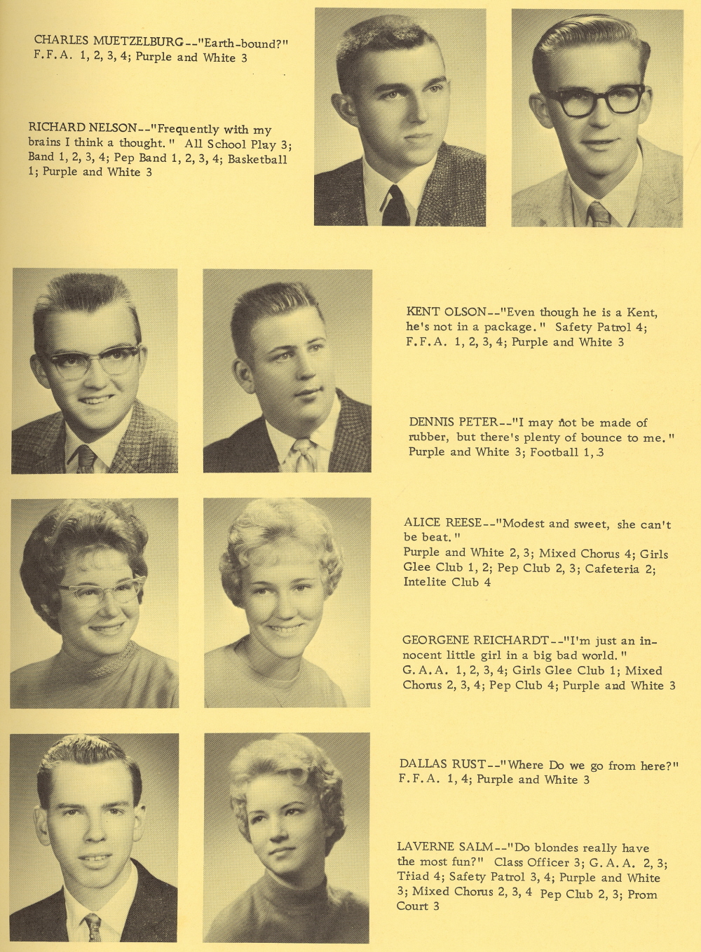 1962 Kiel High School, Page 11: Charles Muetzelburg, Richard Nelson, Kent Olson, Dennis Peter, Alice Reese, Georgene Reichardt, Dallas Rust, Laverne Salm.