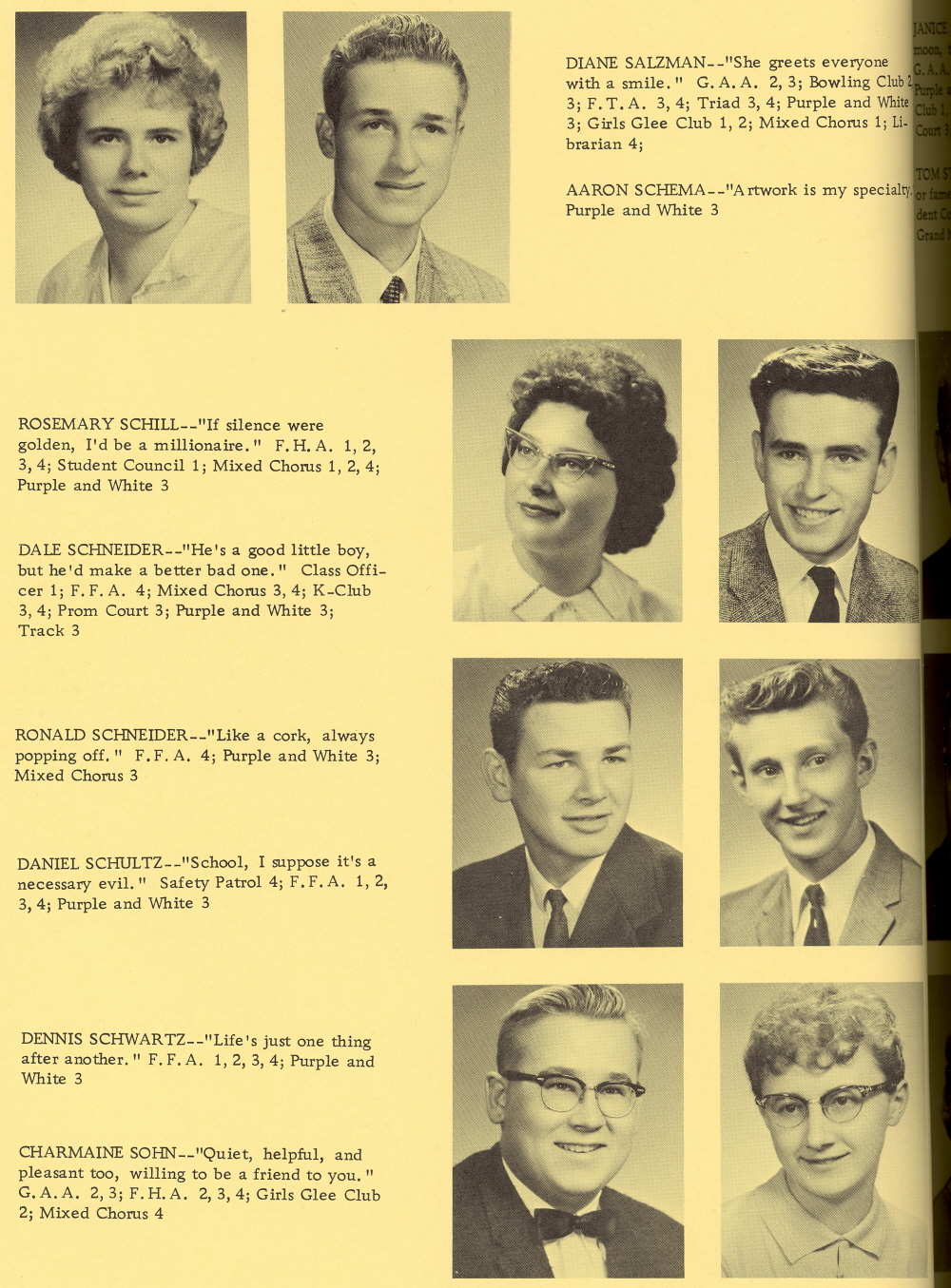 1962 Kiel High School, Page 12: Diane Salzman, Aaron Schema, Rosemary Schill, Dale Schneider, Ronald Schneider, Daniel Schultz, Dennis Schwartz, Charmaine Sohn.