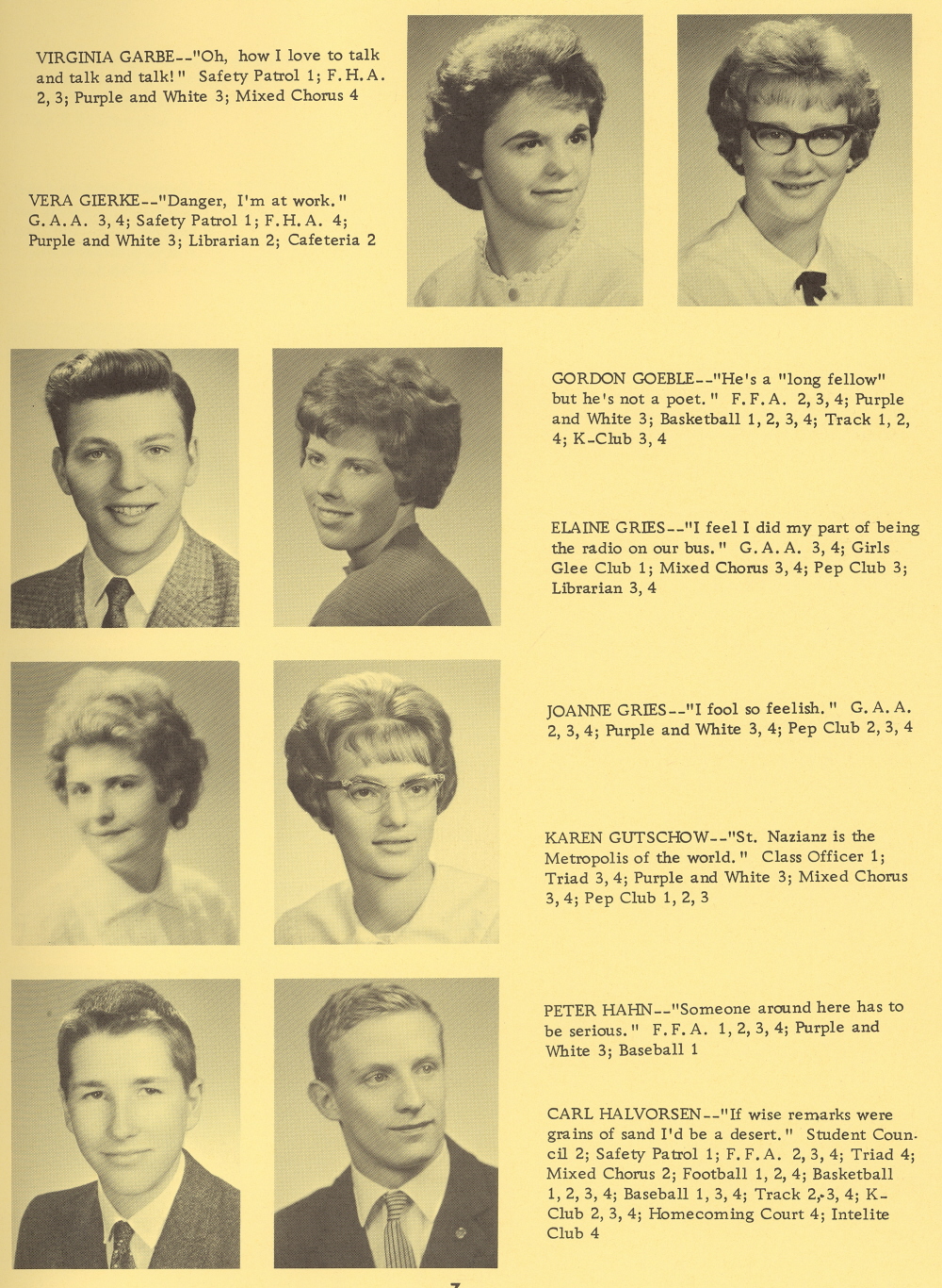 1962 Kiel High School, Page 7: Virginia Garbe, Vera Gierke, Gordon Goeble, Elaine Gries, Joanne Gries, Karen Gutschow, Peter Hahn, Carol Halvorsen.