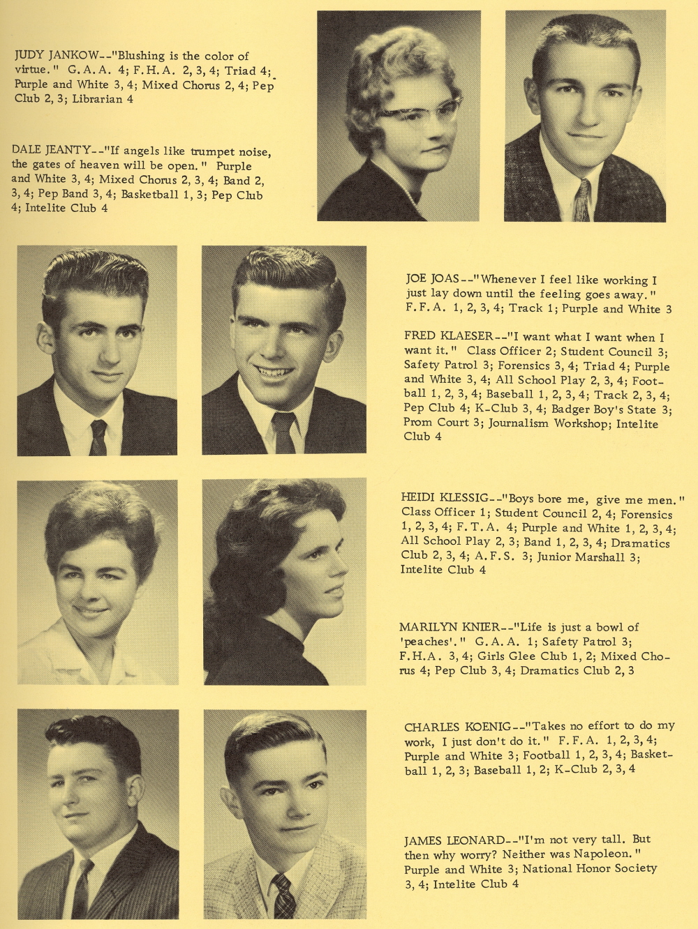 1962 Kiel High School, Page 9: Judy Jankow, Dale Jeanty, Joe Joas, Fred Klaeser, Heidi Klessig, Marilyn Knier, Charles Koenig, James Leonard.