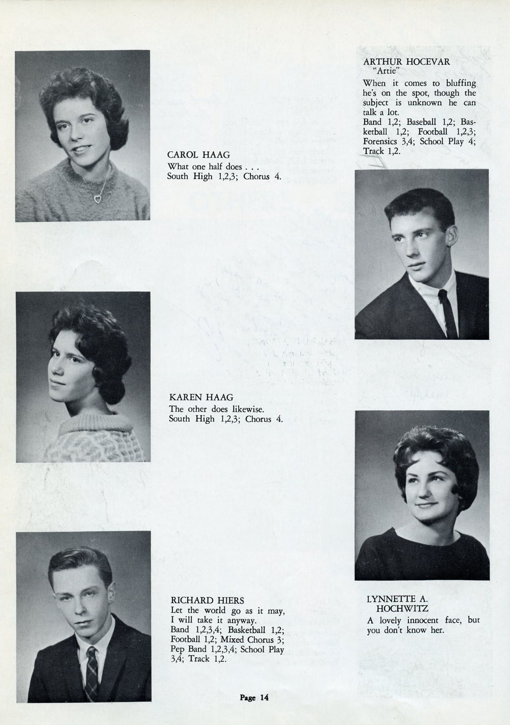 1962 Kohler High School Yearbook, Page 14: Carol Haag, Karen Haag, Richard Hiers, Arthur Hocevar, Lynnette A. Hochwitz.