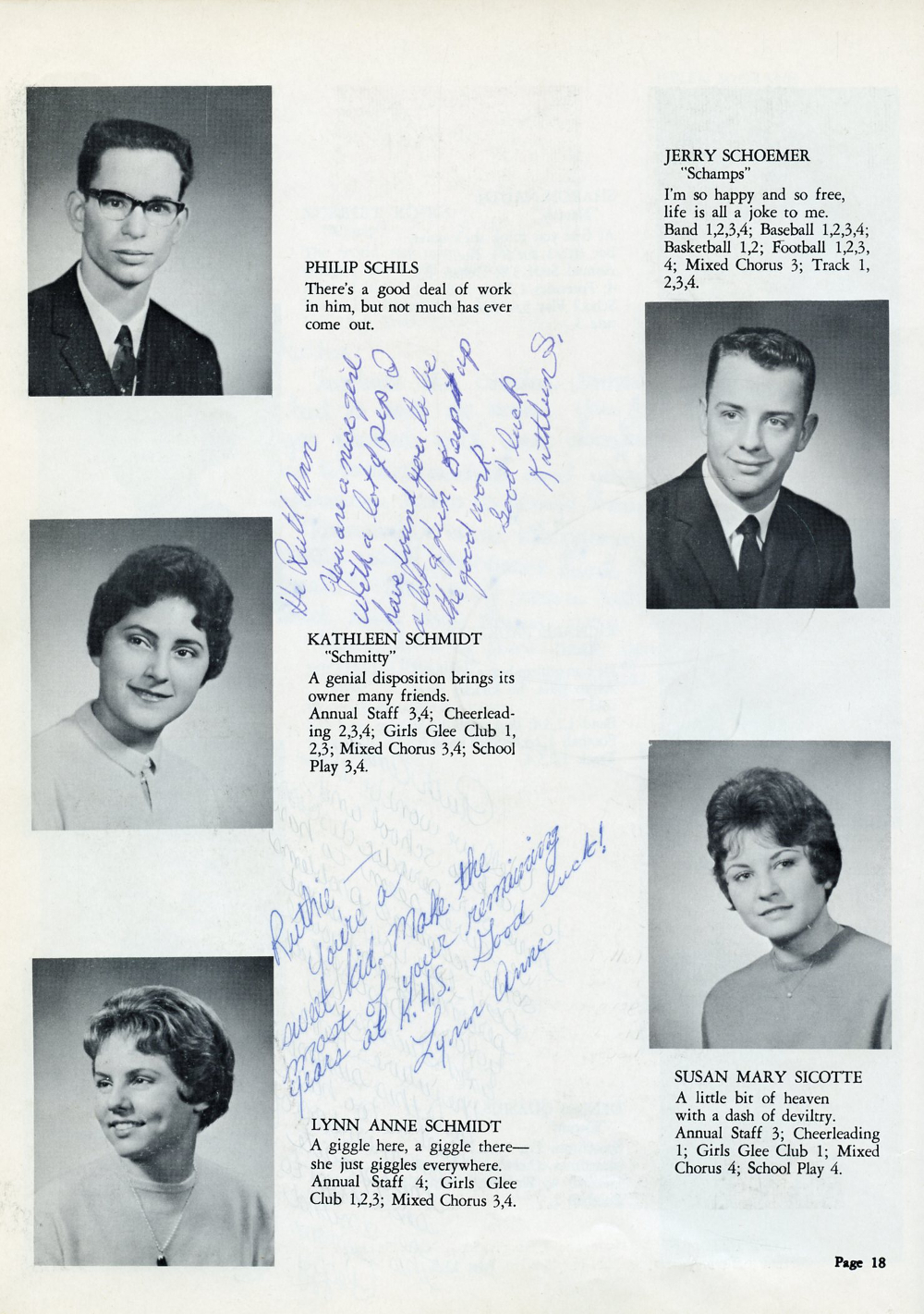 1962 Kohler High School Yearbook, Page 18: Philip Schils, Kathleen Schmidt, Lynn Anne Schmidt, Jerry Schoemer, Susan Mary Sicotte.