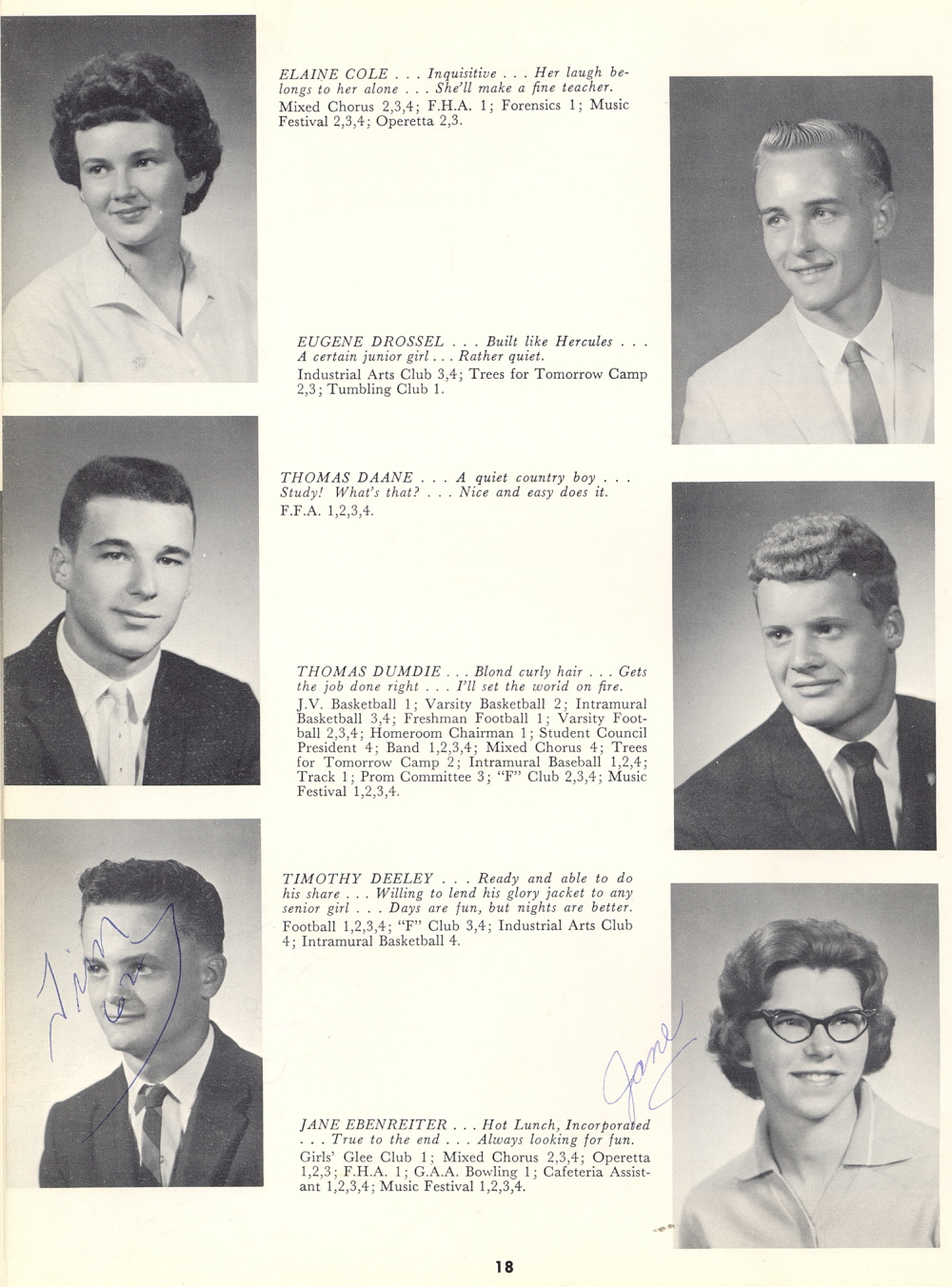 1962 Sheboygan Falls High School, Page 18: Elaine Cole, Thomas Daane, Timothy Deeley, Eugene Drossel, Thomas Dumdie, Jane Ebenreiter.