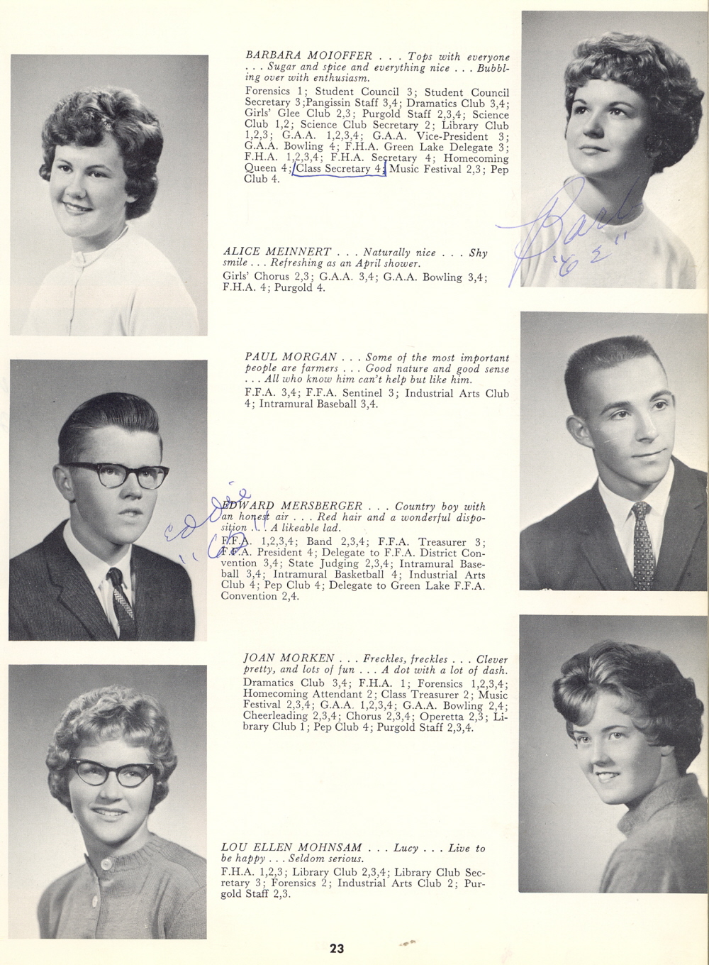 1962 Sheboygan Falls High School, Page 23: Alice Meinnert, Edward Mersberger, Lou Ellen Mohnsam, Barbara Moioffer, Paul Morgan, Joan Morken.