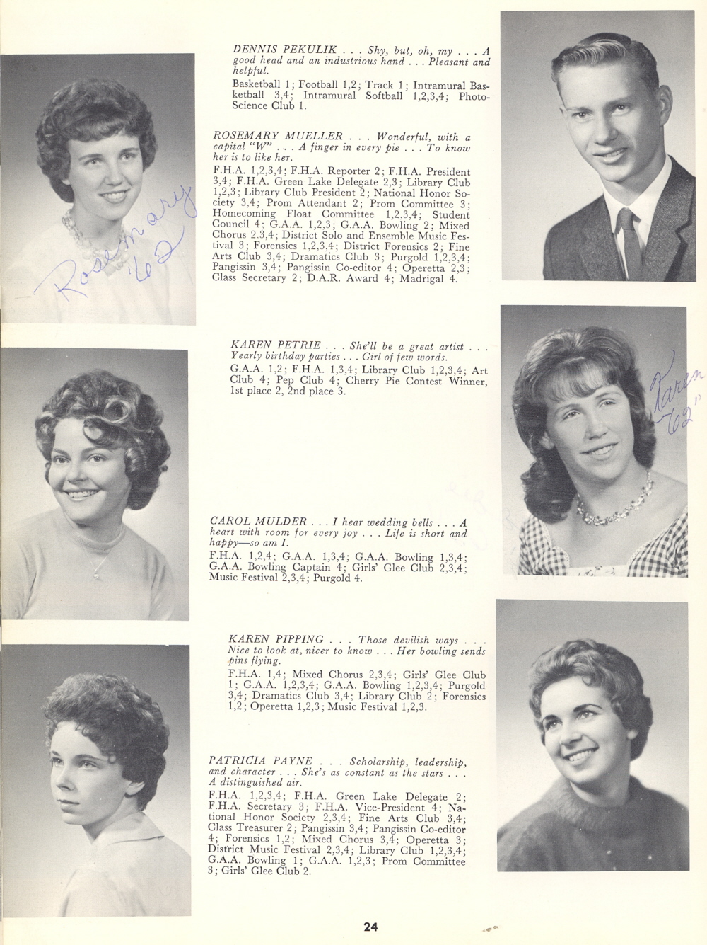 1962 Sheboygan Falls High School, Page 24: Rosemary Mueller, Carol Mulder, Patricia Payne, Dennis Pekulik, Karen Petrie, Karen Pipping.
