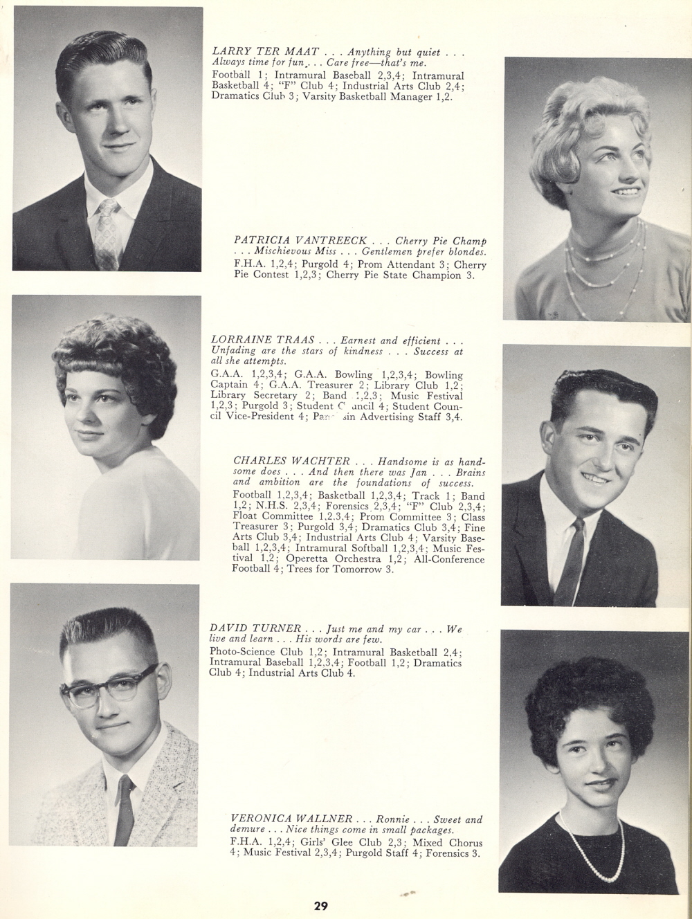 1962 Sheboygan Falls High School, Page 29: Larry Ter Maat, Lorraine Traas, David Turner, Patricia Vantreeck, Charles Wachter, Veronica Wallner.
