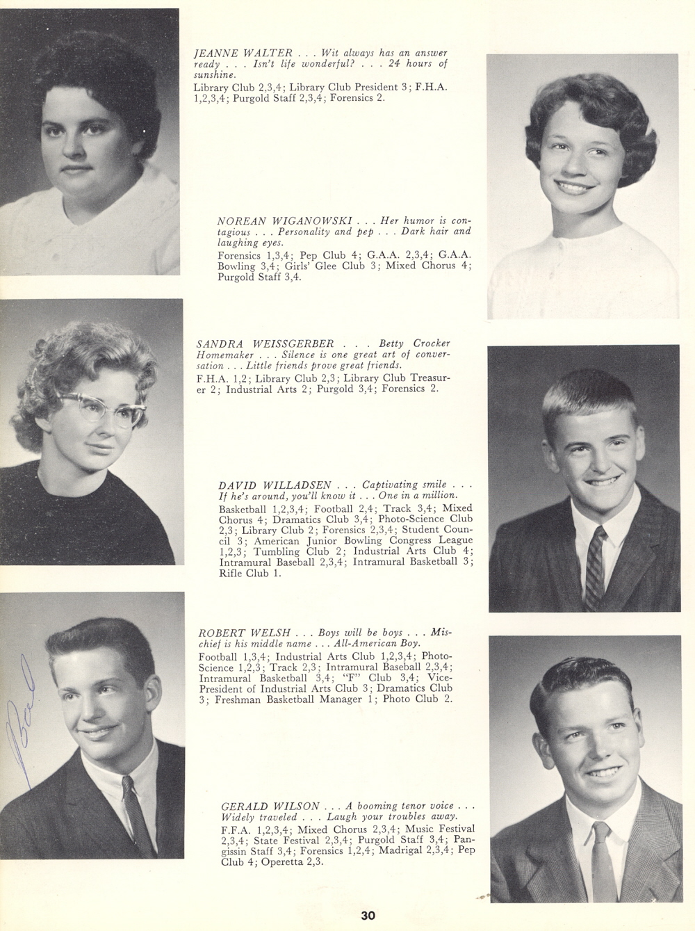 1962 Sheboygan Falls High School, Page 30: Jeanne Walter, Sandra Weissgerber, Robert Welsh, Norean Wiganowski, David Willadsen, Gerald Wilson.