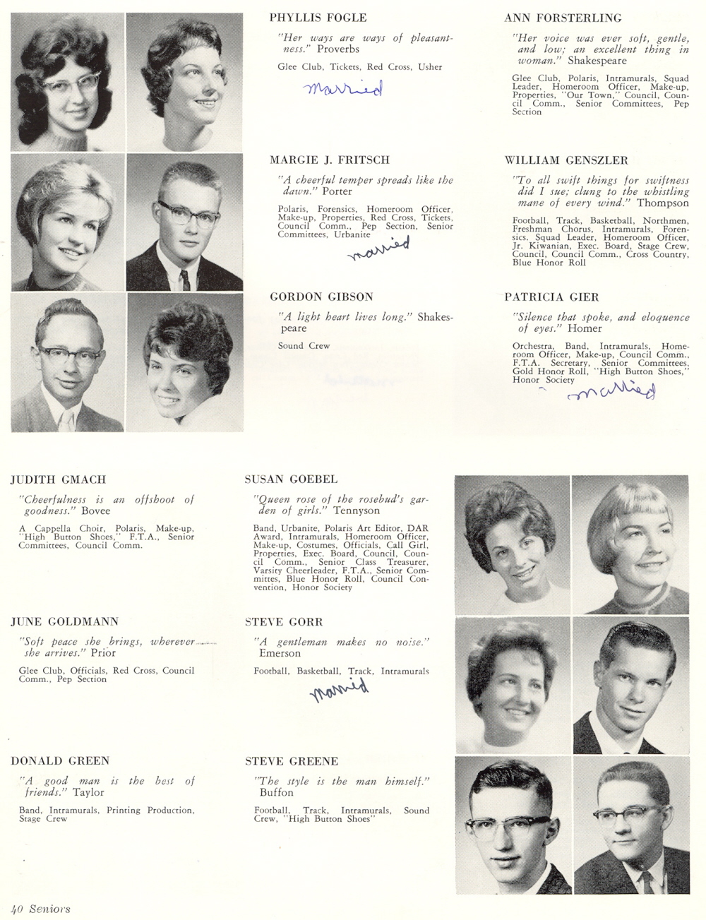 1962 Sheboygan North High School, Page 40: Phyllis Fogle, Ann Forsterling, Margie Fritsch, William Genszler, Gordon Gibson, Patricia Gier, Judith Gmach, Susan Goebel, June Goldmann, Steve Gorr, Donald Green, Steve Greene.