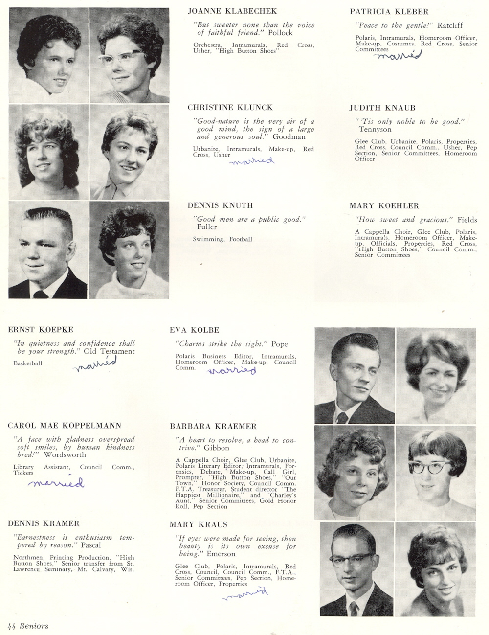 1962 Sheboygan North High School, Page 44: Joanne Klabechek, Patricia Kleber, Christine Klunck, Judith Knaub, Dennis Knuth, Mary Koehler, Ernst Koepke, Eva Kolbe, Carol Mae Koppelmann, Barbara Kraemer, Dennis Kramer, Mary Kraus.