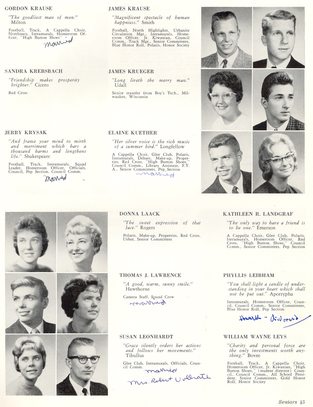 1962 Sheboygan North High School, Page 45: Gordon Krause, James Krause, Sandra Krebsbach, James Krueger, Jerry Krysak, Elaine Kuether, Donna Laack, Kathleen Landgraf, Thomas Lawrence, Phyllis Leibham, Susan Leonhardt, William Leys.