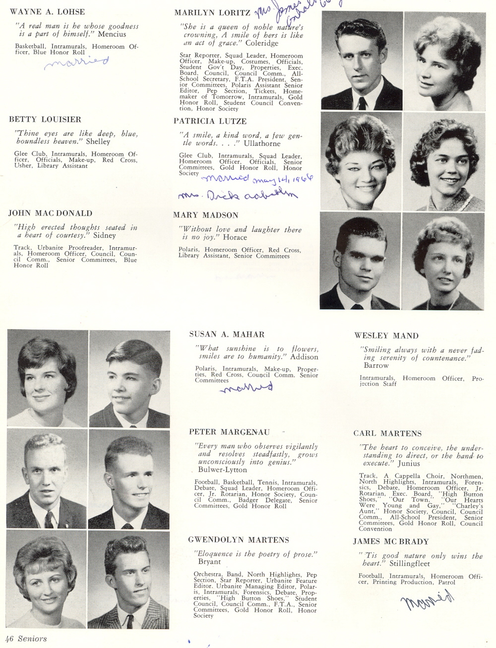 1962 Sheboygan North High School, Page 46: Wayne Lohse, Marilyn Loritz, Bety Louisier, Patricia Lutze, John Mac Donald, Mary Madson, Susan Mahar, Wesley Mand, Peter Margenau, Carl Martens, Gwendolyn Martens, James Mc Brady.