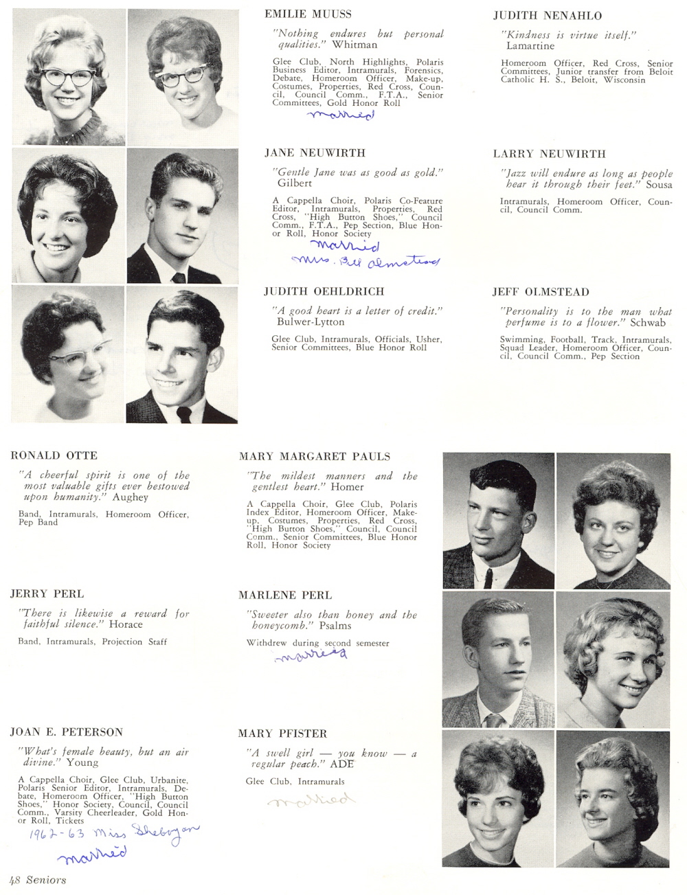 1962 Sheboygan North High School, Page 48: Emilie Muuss, Judith Nenahlo, Jane Neuwirth, Larry Neuwirth, Judith Oehldrich, Jeff Olmstead, Ronald Otte, Mary Pauls, Jerry Perl, Marlene Perl, Joan Peterson, Mary Pfister.