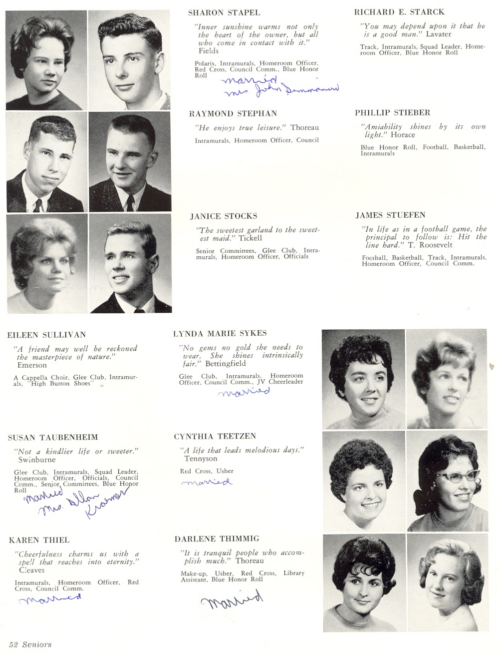 1962 Sheboygan North High School, Page 52: Sharon Stapel, Richard Starck, Raymond Stephan, Phillip Stieber, Janice Stocks, James Stuefen, Eileen Sullivan, Lynda Sykes, Susan Taubenheim, Cynthia Teetzen, Karen Thiel, Darlene Thimmig.