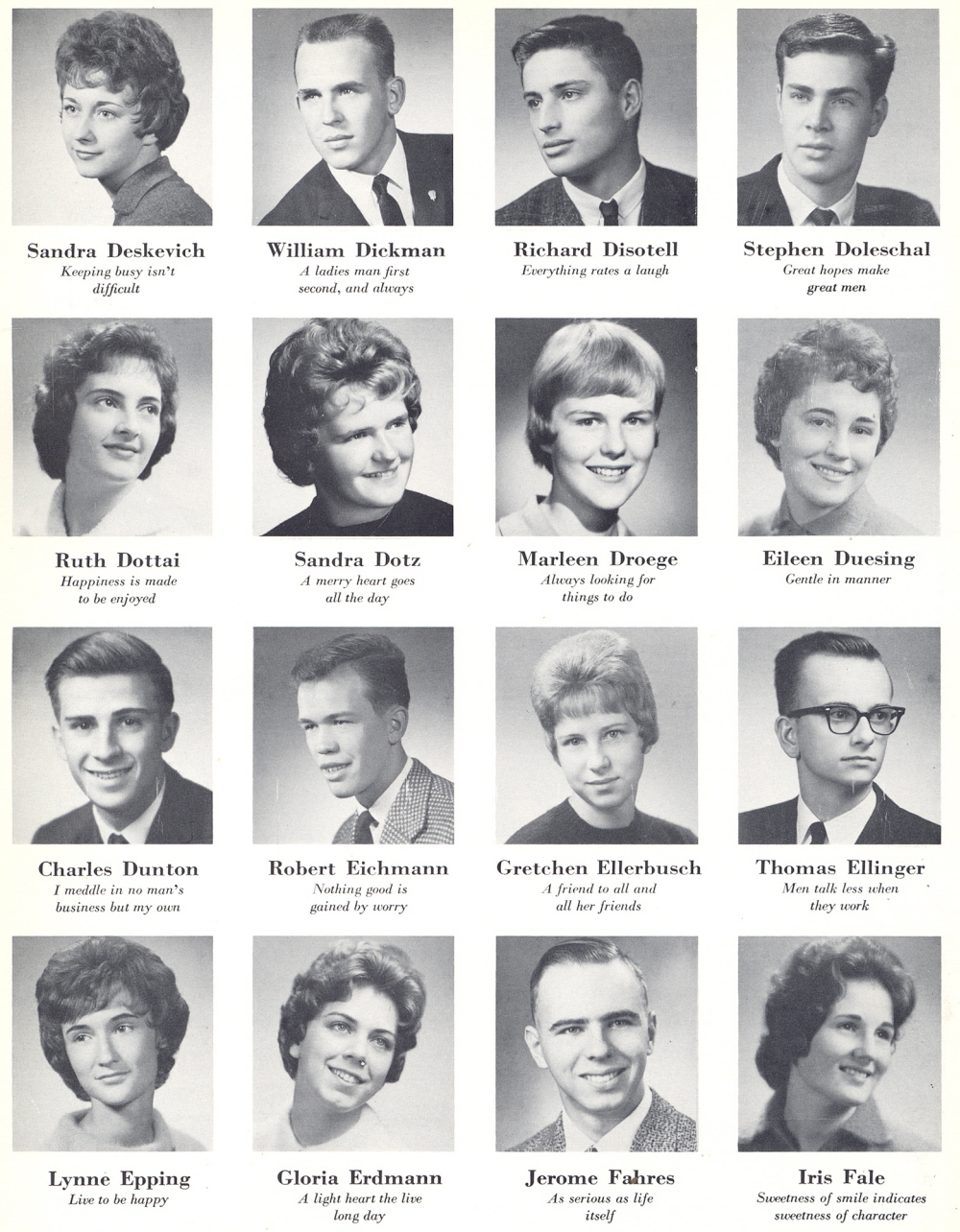 High School, Page 26: Sandra Deskevich, William Dickman, Richard Disotell, Stephen Doleschal, Ruth Dottai, Sandra Dotz, Marleen Droege, Eileen Duesing, Charles Dunton, Robert Eichmann, Gretchen Ellerbusch, Thomas Ellinger, Lynne Epping, Gloria Erdmann, Jerome Fahres, Iris Fale.