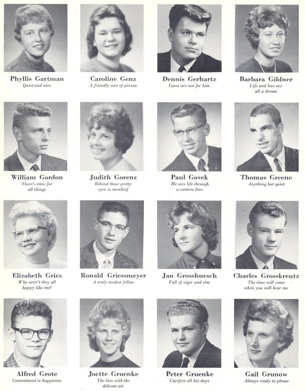 High School, Page 28: Phyllis Gartman, Caroline Genz, Dennis Gerhartz, Barbara Gildner, William Gordon, Judith Gorenz, Paul Govek, Thomas Greene, Elizabeth Gries, Ronald Griessmeyer, Jan Grosshuesch, Charles Grosskreutz, Alfred Grote, Joette Gruenke, Peter Gruenke, Gail Grunow.