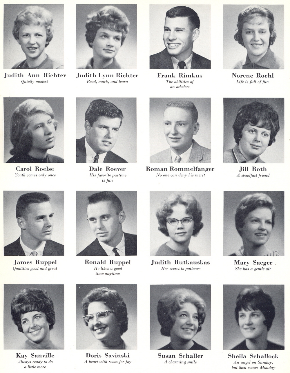 High School, Page 38: Judith Ann Richter, Judith Lynn Richter, Frank Rimkus, Norene Roehl, Carol Roelse, Dale Roever, Dale Rommelfanger, Jill Roth, James Ruppel, Ronald Ruppel, Judith Rutkauskas, Mary Saeger, Kay Sanville, Doris Savinski, Susan Schaller, Sheila Schallock.