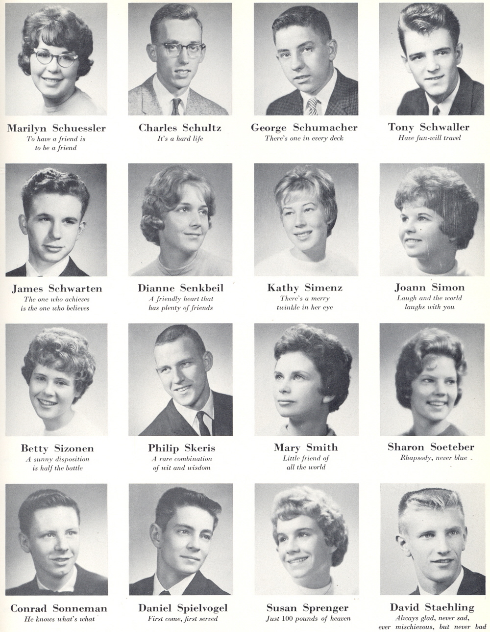 High School, Page 41: Marilyn Schuessler, Charles Schultz, George Schumacher, Tony Schwaller, James Schwarten, Dianne Senkbeil, Kathy Simenz, Joann Simon, Betty Sizonen, Philip Skeris, Mary Smith, Sharon Soeteber, Conrad Sonneman, Daniel Spielvogel, Susan Sprenger, David Staehling.