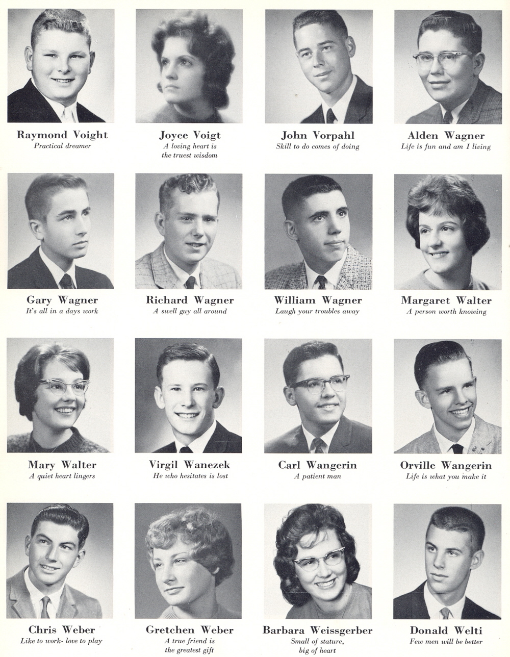 High School, Page 44: Raymond Voight, Joyce Voigt, John Vorpahl, Alden Wagner, Gary Wagner, Richard Wagner, William Wagner, Margaret Walter, Mary Walter, Virgil Wanezek, Carl Wangerin, Orville Wangerin, Chris Weber, Gretchen Weber, Barbara Weissgerber, Donald Welti.