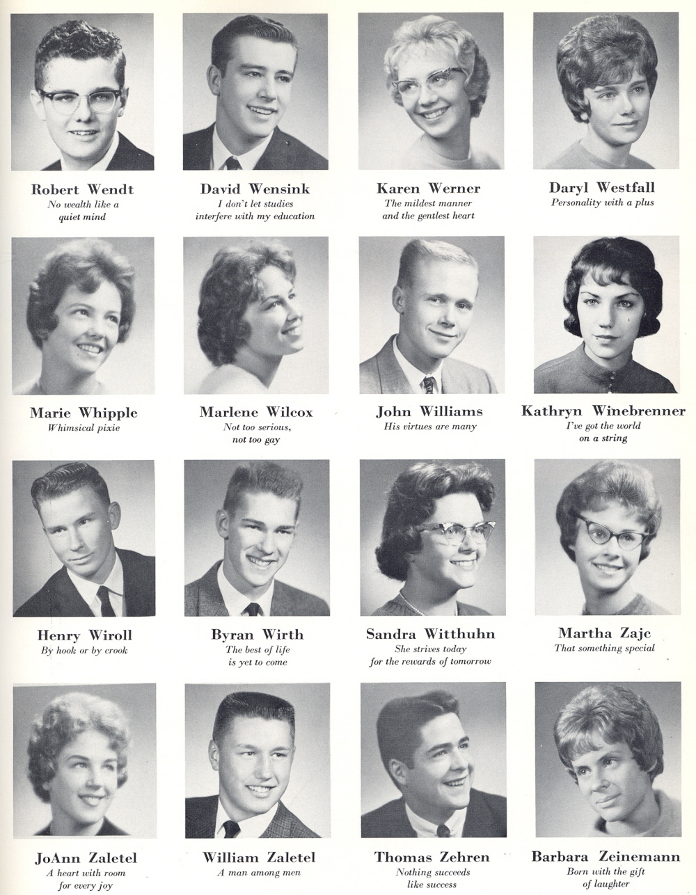 High School, Page 45: Robert Wendt, David Wensink, Karen Werner, Daryl Westfall, Marie Whipple, Marlene Wilcox, John Williams, Kathryn Winebrenner, Henry Wiroll, Bryan Wirth, Sandra Witthuhn, Martha Zaje, JoAnn Zaletel, William Zaletel, Thomas Zehren, Barbara Zeinemann.