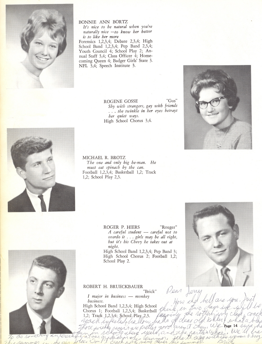 1963 Kohler High School, Page 14: Bonnie Ann Bortz, Rogene Gosse, Michael Brotz, Roger Hiers, Robert Brueckbauer.
