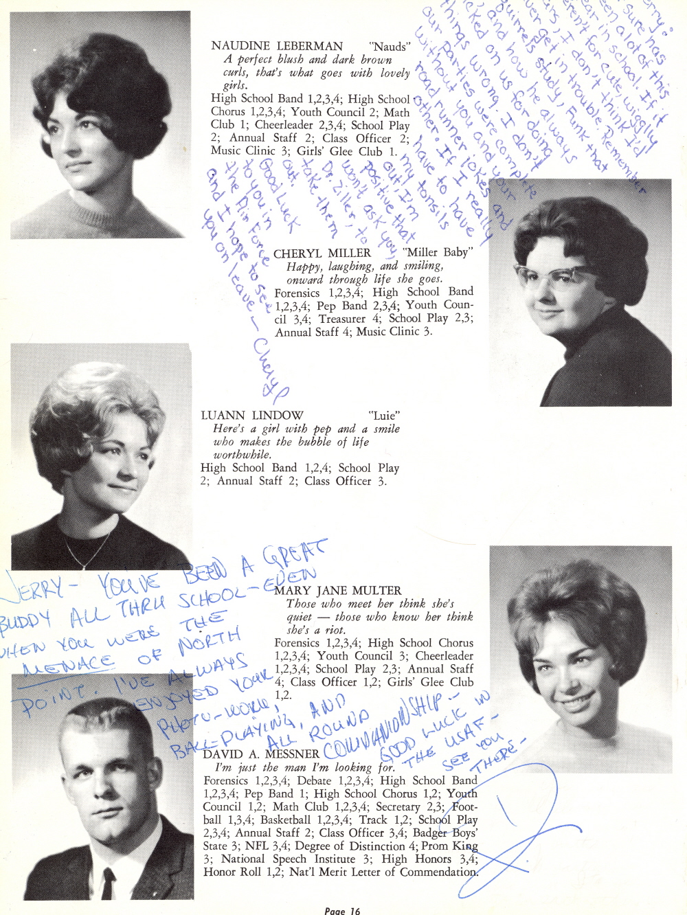 1963 Kohler High School, Page 16: Naudine Leberman, Cheryl Miller, Luann Lindow, Mary Jane Multer, David Messner.