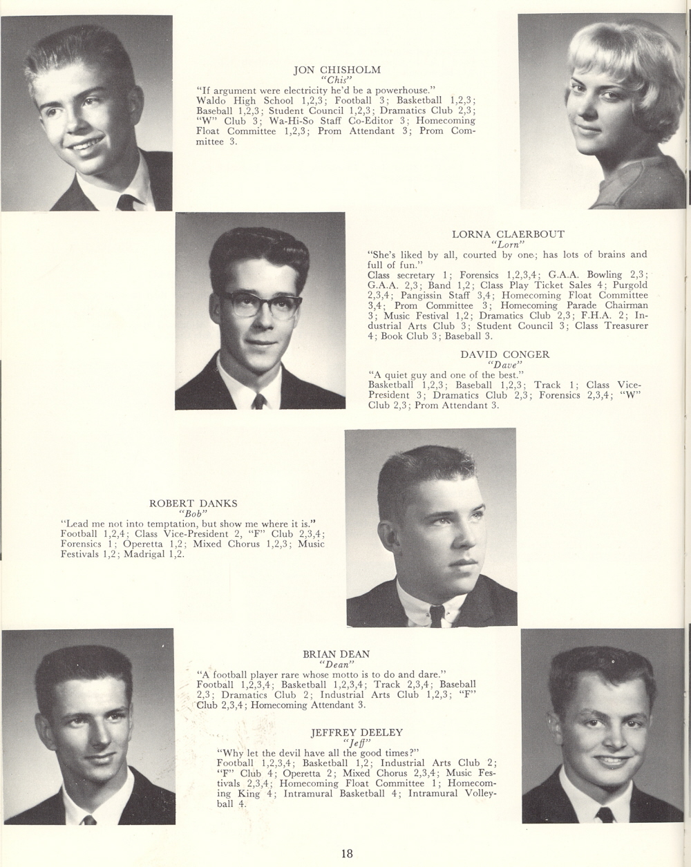 1963 Sheboygan Falls High School, Page 18: Jon Chisholm, Lorna Claerbout, David Conger, Robert Danks, Brian Dean, Jeffrey Deeley.