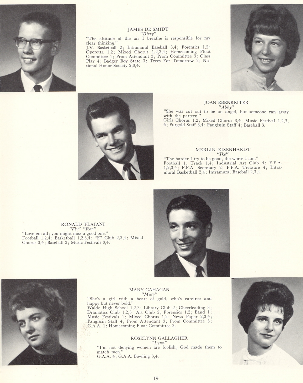 1963 Sheboygan Falls High School, Page 19: James De Smidt, Joan Ebenreiter, Merlin Eisenhardt, Ronald Flaiani, Mary Gahagan, Roselynn Gallagher.