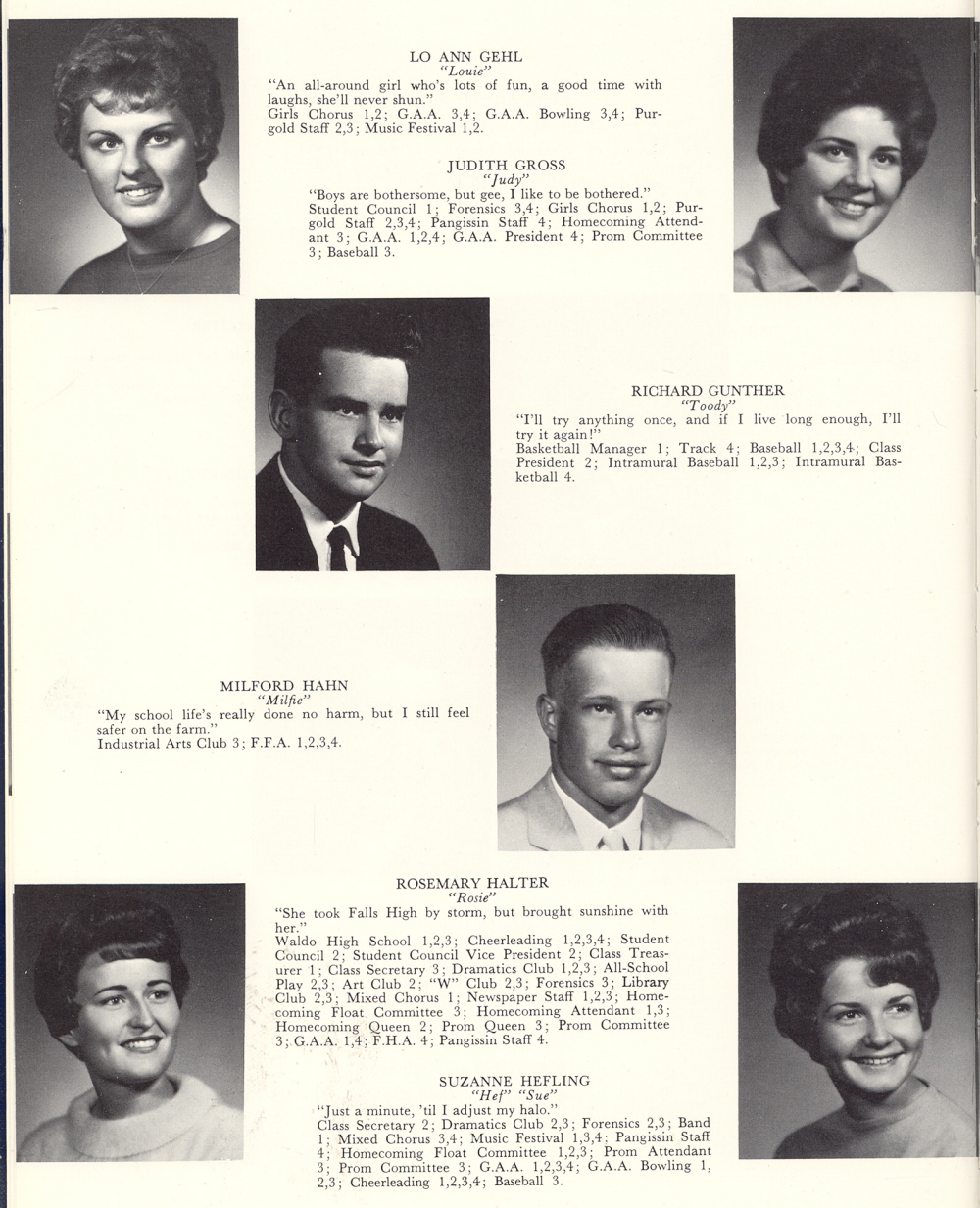 1963 Sheboygan Falls High School, Page 20: Lo Ann Gehl, Judith Gross, Richard Gunther, Milford Hahn, Rosemary Halter, Suzanne Hefling.