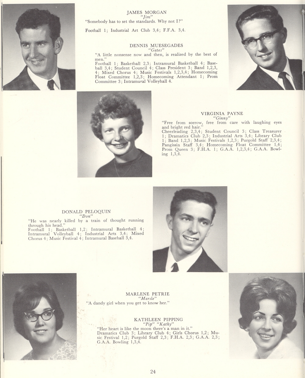 1963 Sheboygan Falls High School, Page 24: James Morgan, Dennis Muesegades, Virginia Payne, Donald Peloquin, Marlene Petrie, Kathleen Pipping.