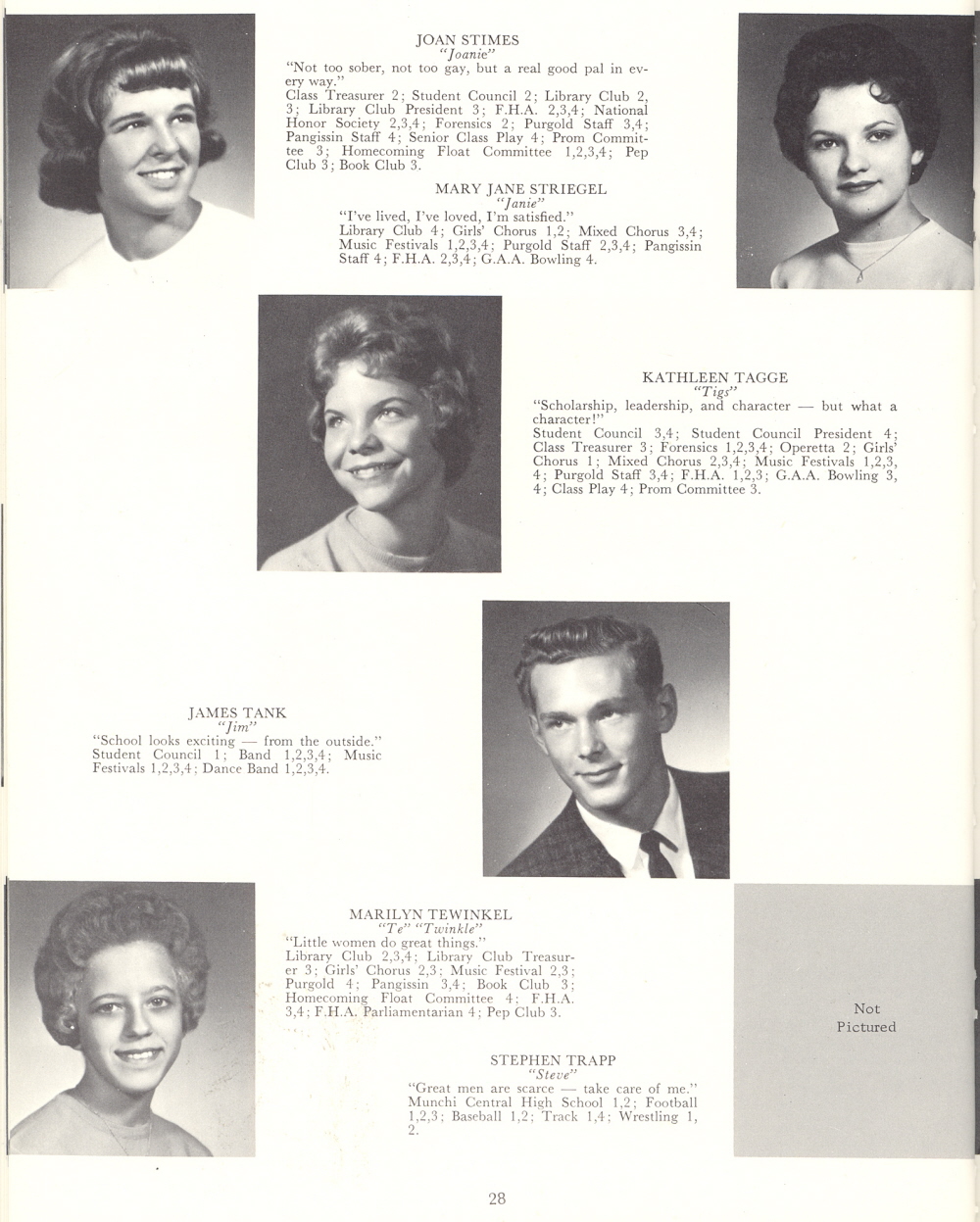 1963 Sheboygan Falls High School, Page 28: Joan Stimes, Mary Jane Striegel, Kathleen Tagge, James Tank, Marilyn Tewinkel, Stephen Trapp.