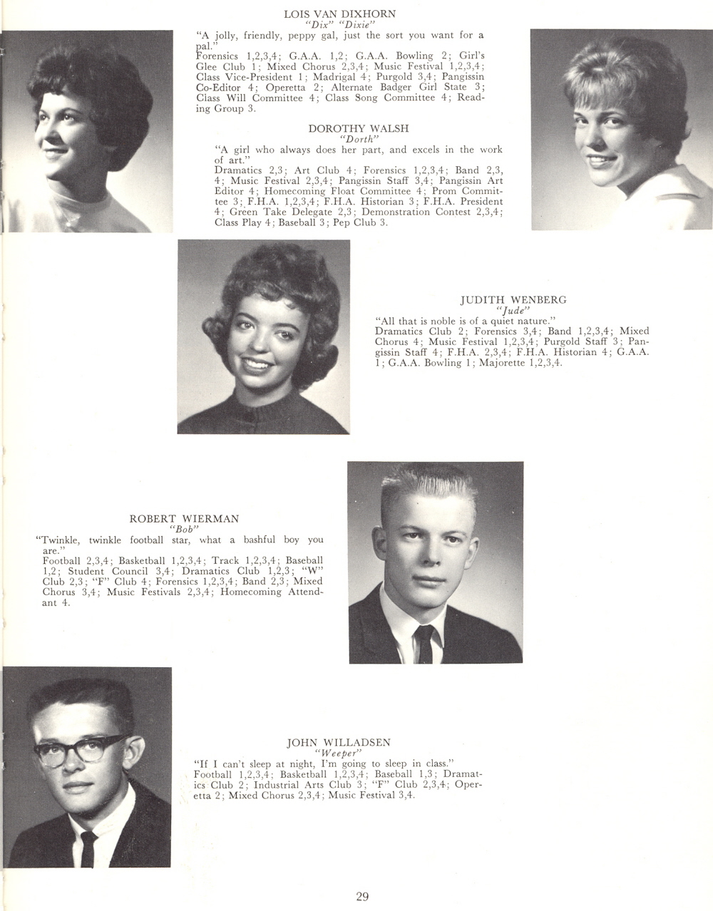 1963 Sheboygan Falls High School, Page 29: Lois Van Dixhorn, Dorothy Walsh, Judith Wenberg, Robert Wierman, John Willadsen.