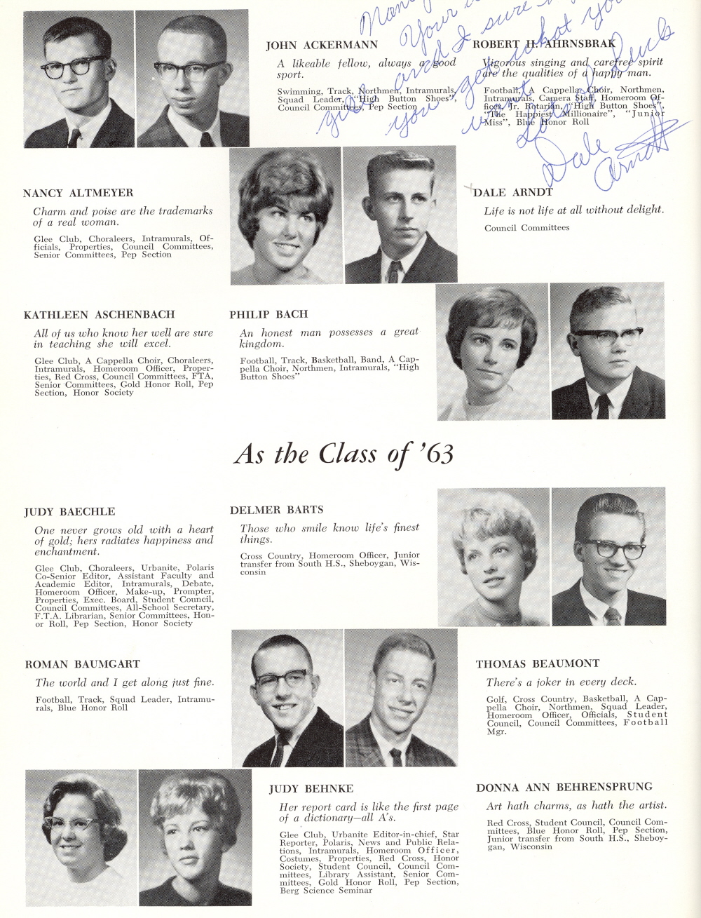 1963 Sheboygan North High School, Page 40: John Ackermann, Robert Ahrnsbrak, Nancy Altmeyer, Dale Arndt, Kathleen Aschenbach, Philip Bach, Judy Baechle, Delmer Barts, Roman Baumgart, Thomas Beaumont, Judy Behnk, Donna Ann Behrensprung.