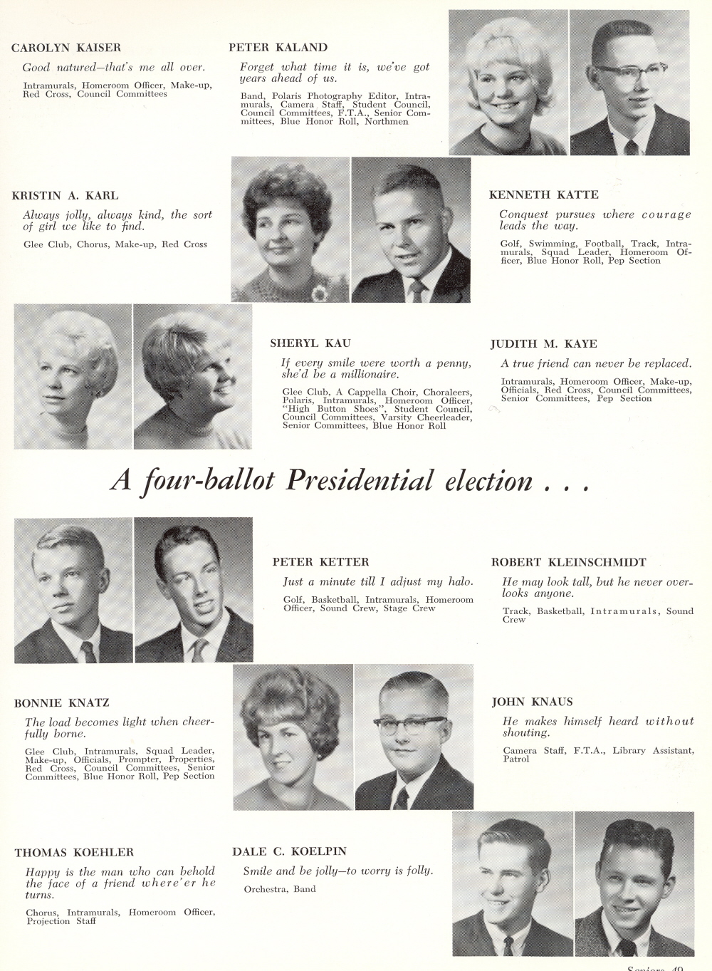 1963 Sheboygan North High School, Page 49: Carolyn Kaiser, Peter Kaland, Kristin Karl, Kenneth Katte, Sheryl Kau, Judith Kaye, Peter Ketter, Robert Klainschmidt, Bonnie Knatz, John Knaus, Thomas Koehler, Dale Koelpin.