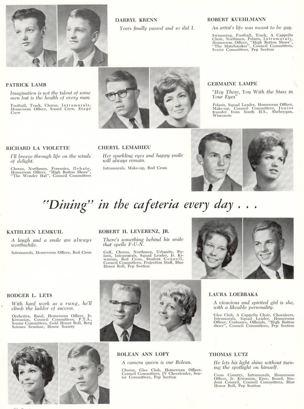 1963 Sheboygan North High School, Page 50: Darryl Krenn, Robert Kuehlmann, Patrick Lamb, Germaine Lampe, Richard La Violette, Cheryl Lemahieu, Kathleen Lemkuil, Robert Leverenz, Rodger Leys, Laura Loebbaka, Rolean Ann Lofy, Thomas Lutz.