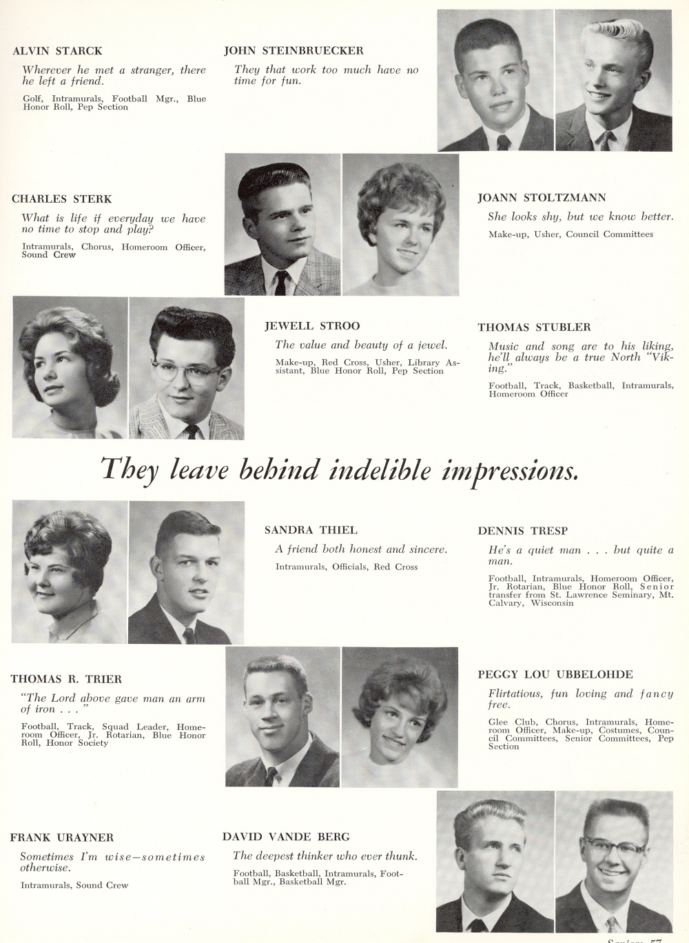 1963 Sheboygan North High School, Page 57: Alvin Starck, John Steinbruecker, Charles Sterk, Joann Stoltzmann, Jewell Stroo, Thomas Stubler, Sandra Thiel, Dennis Tresp, Thomas Trier, Peggy Lou Ubbelohde, Frank Urayner, David Vande Berg.