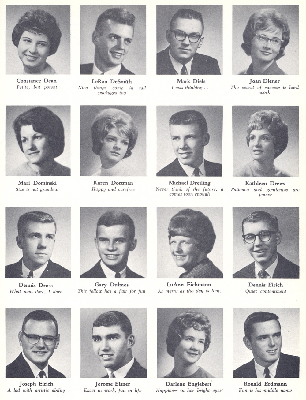 1963 Sheboygan South High School, Page 25: Constance Dean, LeRon DeSmith, Mark Diels, Joan Diener, Mari Dominski, Karen Dortman, Michael Dreiling, Kathleen Drews, Dennis Dross, Gary Dulmes, LuAnn Eichmann, Dennis Eirich, Joseph Eirich, Jerome, Eisner, Darlene Englebert, Ronald Erdmann.