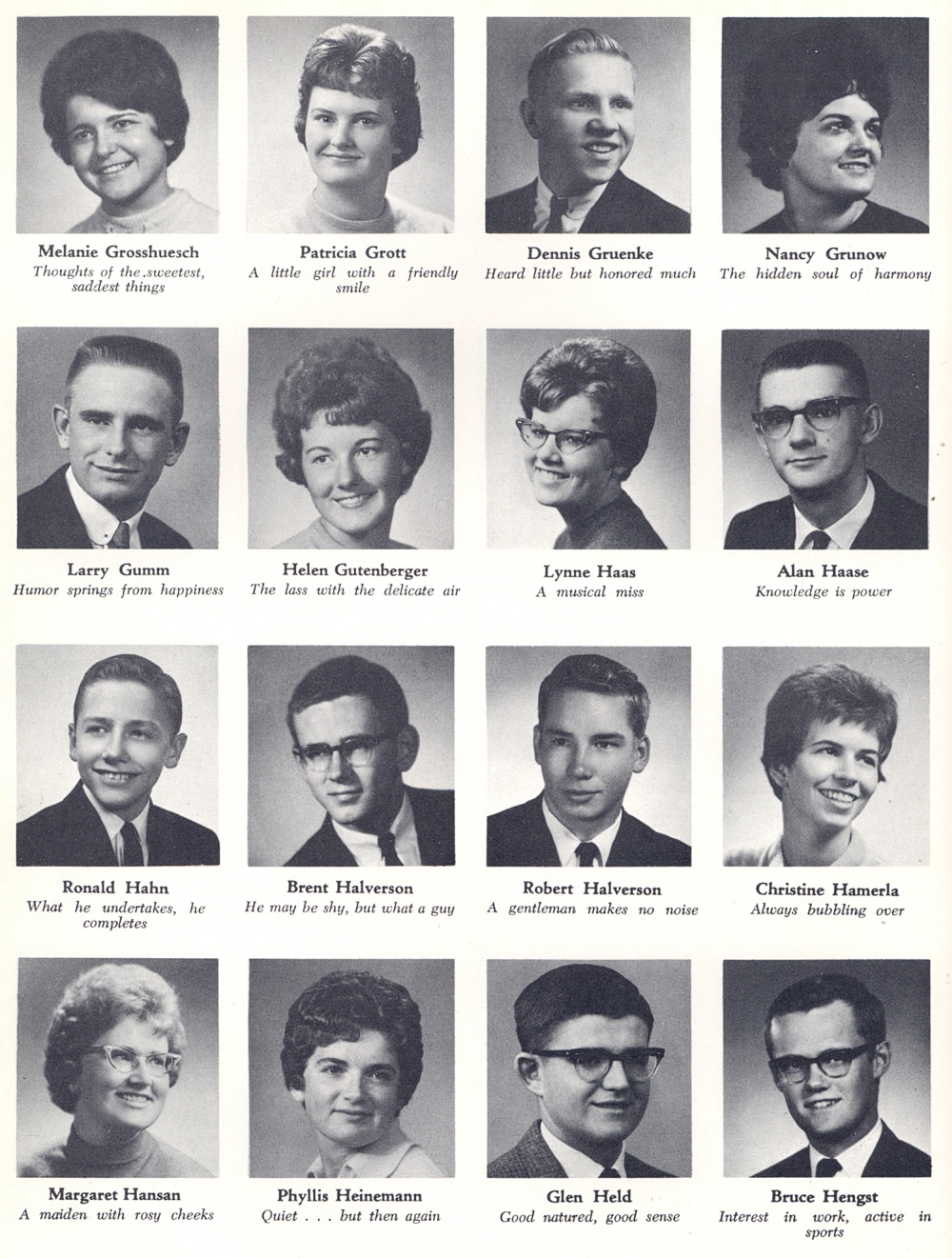 1963 Sheboygan South High School, Page 28: Melanie Grossheusch, Patricia Grott, Dennis Gruenke, Nancy Grunow, Larry Gumm, Helen Gutenberger, Lynne Haas, Alan Haase, Ronald Hahn, Brent Halverson, Robert Halverson, Christine Hamerla, Margaret Hansan, Phyllis Heinemann, Glen Held, Bruce Hengst.