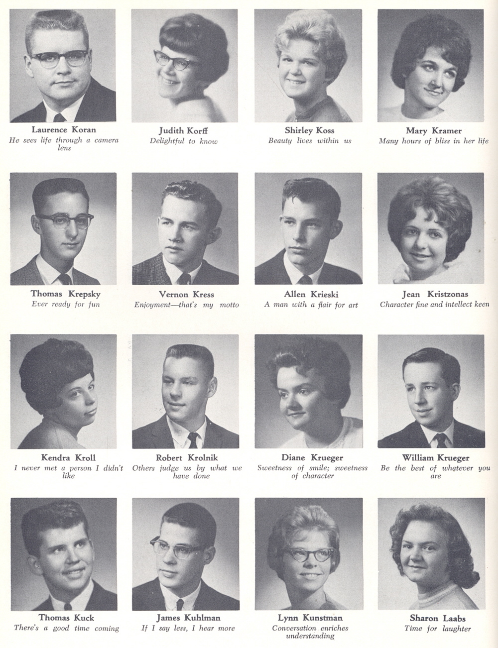 1963 Sheboygan South High School, Page 32: Laurence Koran, Judith Korff, Shirley Koss, Mary Kramer, Thomas Krepsky, Vernon Kress, Allen Krieski, Jean Kristzonas, Kendra Kroll, Robert Krolnik, Diane Krueger, William Krueger, Thomas Kuck, James Kuhlman, Lynn Kunstman, Sharon Laabs.