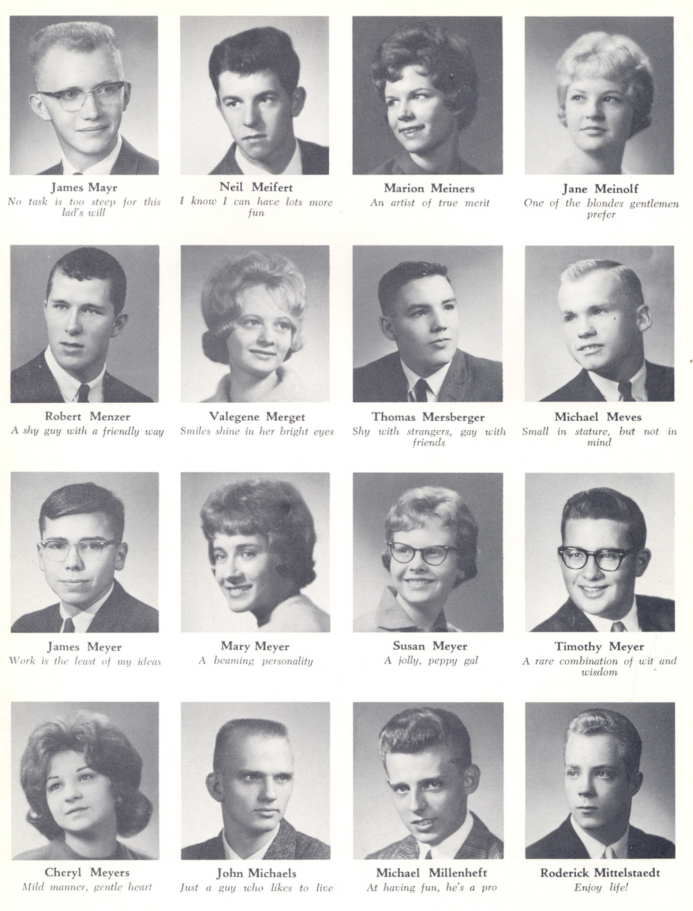 1963 Sheboygan South High School, Page 34: James Mayr, Neil Meifert, Marion Meiners, Jane Meinolf, Robert Menzer, Valegene Merget, Thomas Mersberger, Michael Meves, James Meyer, Mary Meyer, Susan Meyer, Timothy Meyer, Cheryl Meyers, John Michaels, Michael Millenheft, Roderick Mittelstaedt.