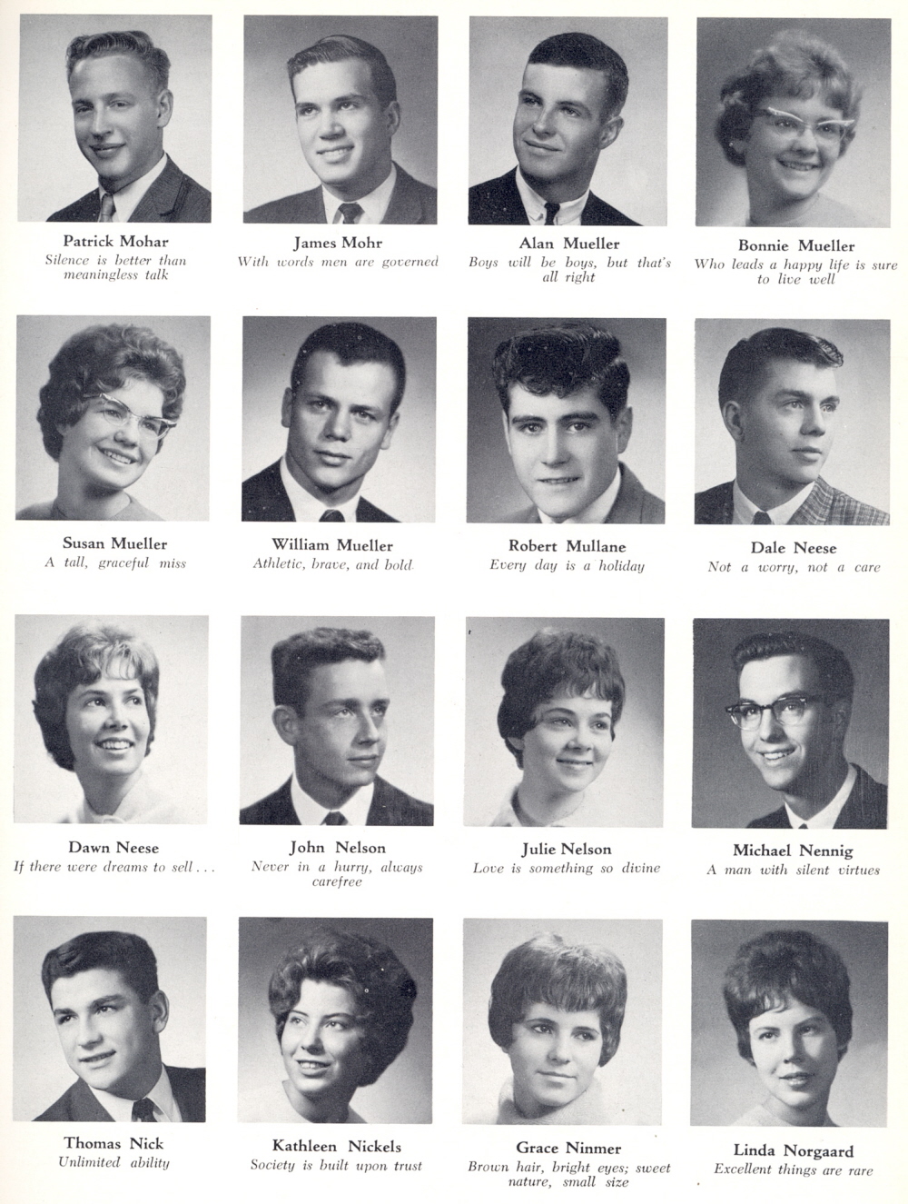 1963 Sheboygan South High School, Page 35: Patrick Mohar, James Mohr, Alan Mueller, Bonnie Mueller, Susan Mueller, William Mueller, Robert Mullane, Dale Neese, Dawn Neese, John Nelson, Julie Nelson, Michael Nennig, Thomas Nick, Kathleen Nickels, Grace Ninmer, Linda Norgaard.