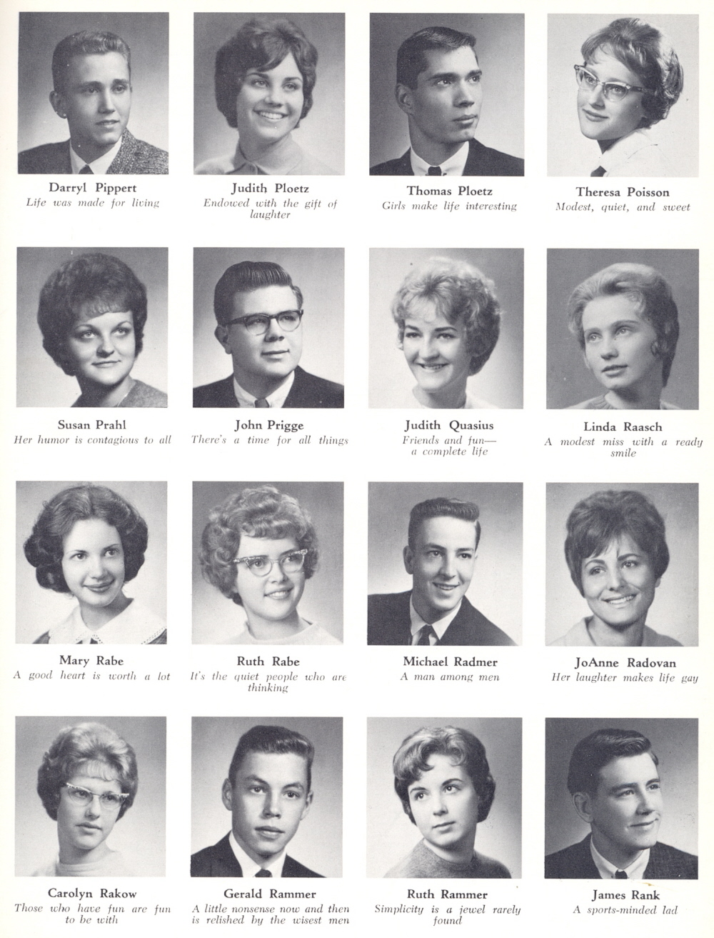 1963 Sheboygan South High School, Page 37: Darryl Pippert, Judith Ploetz, Thomas Ploetz, Theresa Poisson, Susan Prahl, John Prigge, Judith Quasius, Linda Raasch, Mary Rabe, Ruth Rabe, Michael Radmer, JoAnne Radovan, Carolyn Rakow, Gerald Rammer, Ruth Rammer, James Rank.