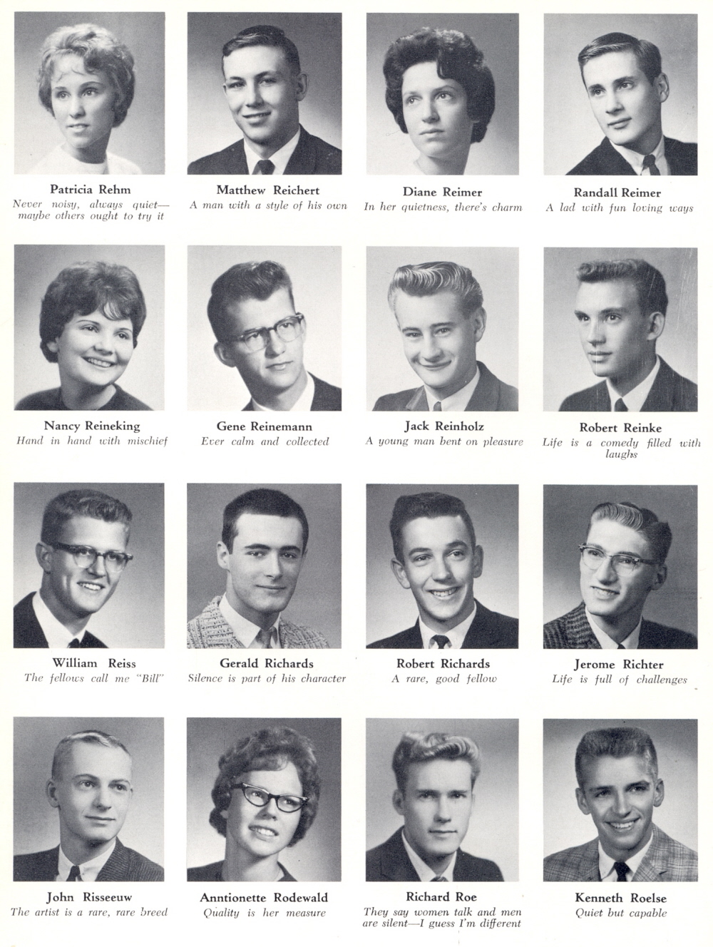 1963 Sheboygan South High School, Page 38: Patricia Rehm, Matthew Reichert, Diane Reimer, Randall Reimer, Nancy Reineking, Gene Reinemann, Jack Reinholz, Robert Reinke, William Reiss, Gerald Richards, Robert Richards, Jerome Richter, John Risseeuw, Anntionette Rodewald, Richard Roe, Kenneth Roelse.