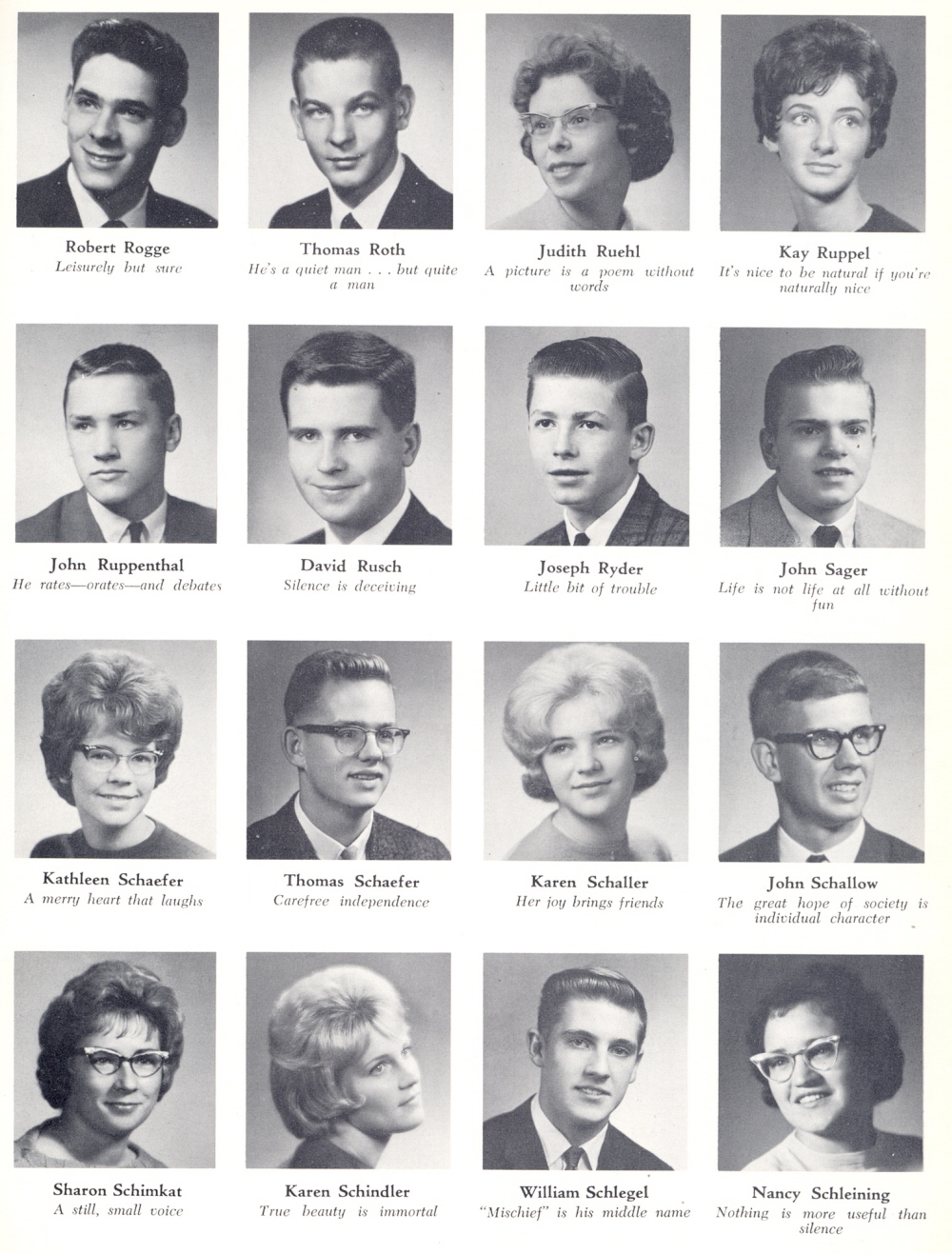 1963 Sheboygan South High School, Page 39: Robert Rogge, Thomas Roth, Judith Ruehl, Kay Ruppel, John Ruppenthal, David Rusch, Joseph Ryder, John Sager, Kathleen Schaefer, Thomas Schaefer, Karen Schaller, John Schallow, Sharon Schimkat, Karen Schindler, William Schlegel, Nancy Schleining.