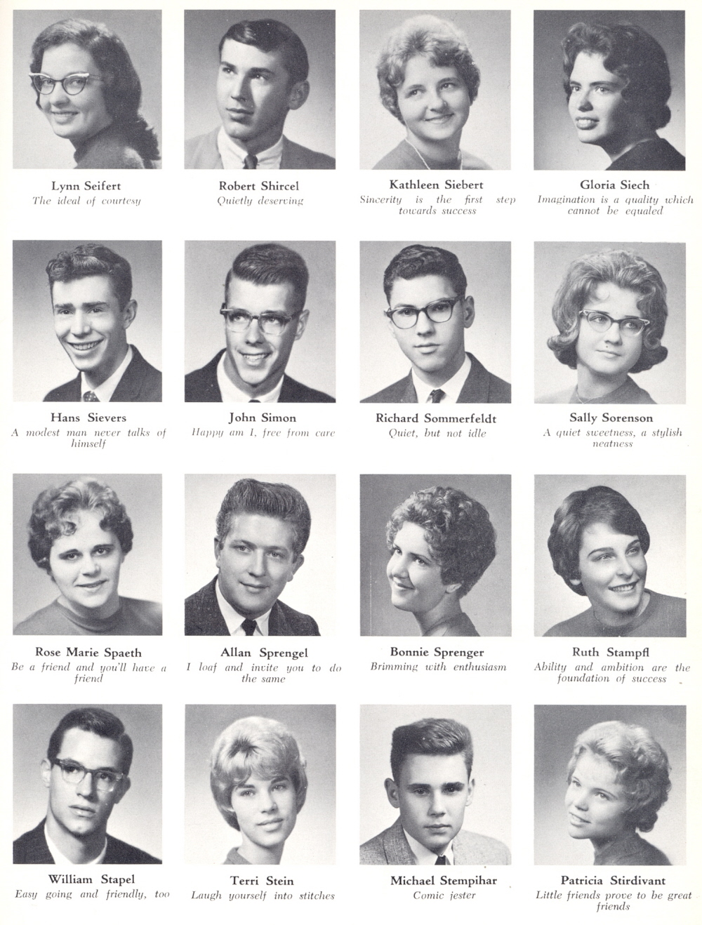 1963 Sheboygan South High School, Page 41: Lynn Seifert, Robert Shircel, Kathleen Siebert, Gloria Siech, Hans Sievers, John Simon, Richard Sommerfeldt, Sally Sorenson, Rose Marie Spaeth, Allan Sprengel, Bonnie Sprenger, Ruth Stampfl, William Stapel, Terri Stein, Michael Stempihar, Patricia Stirdivant.