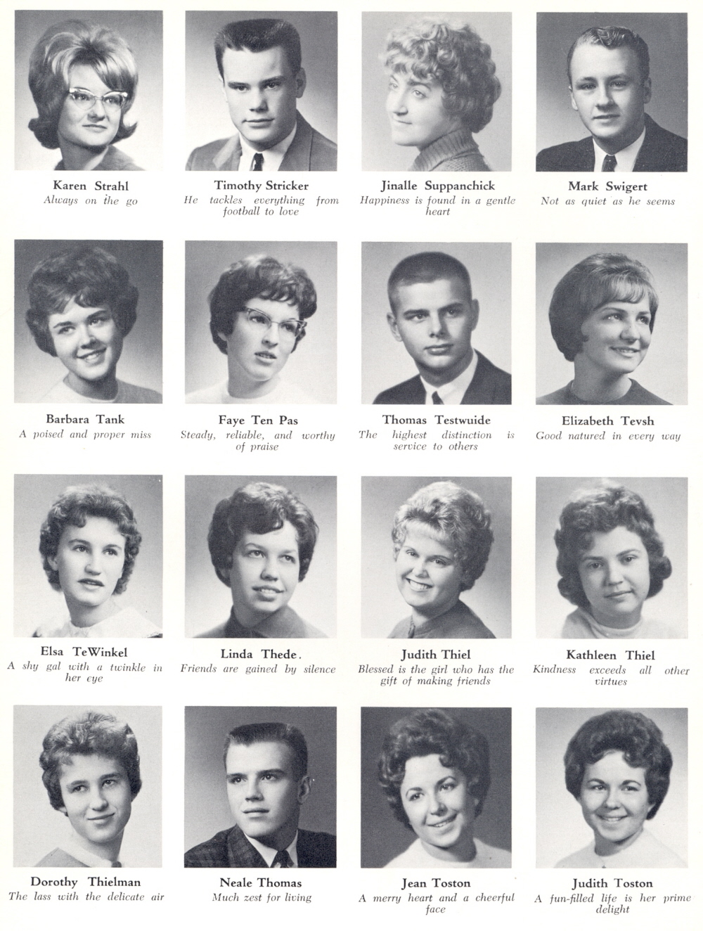 1963 Sheboygan South High School, Page 42: Karen Strahl, Timothy Stricker, Jinalle Suppanchick, Mark Swigert, Barbara Tank, Faye Ten Pas, Thomas Testwuide, Elizabeth Tevsh, Elsa TeWinkel, Linda Thede, Judith Thiel, Kathleen Thiel, Dorothy Thielman, Neale Thomas, Jean Toston, Judith Toston.
