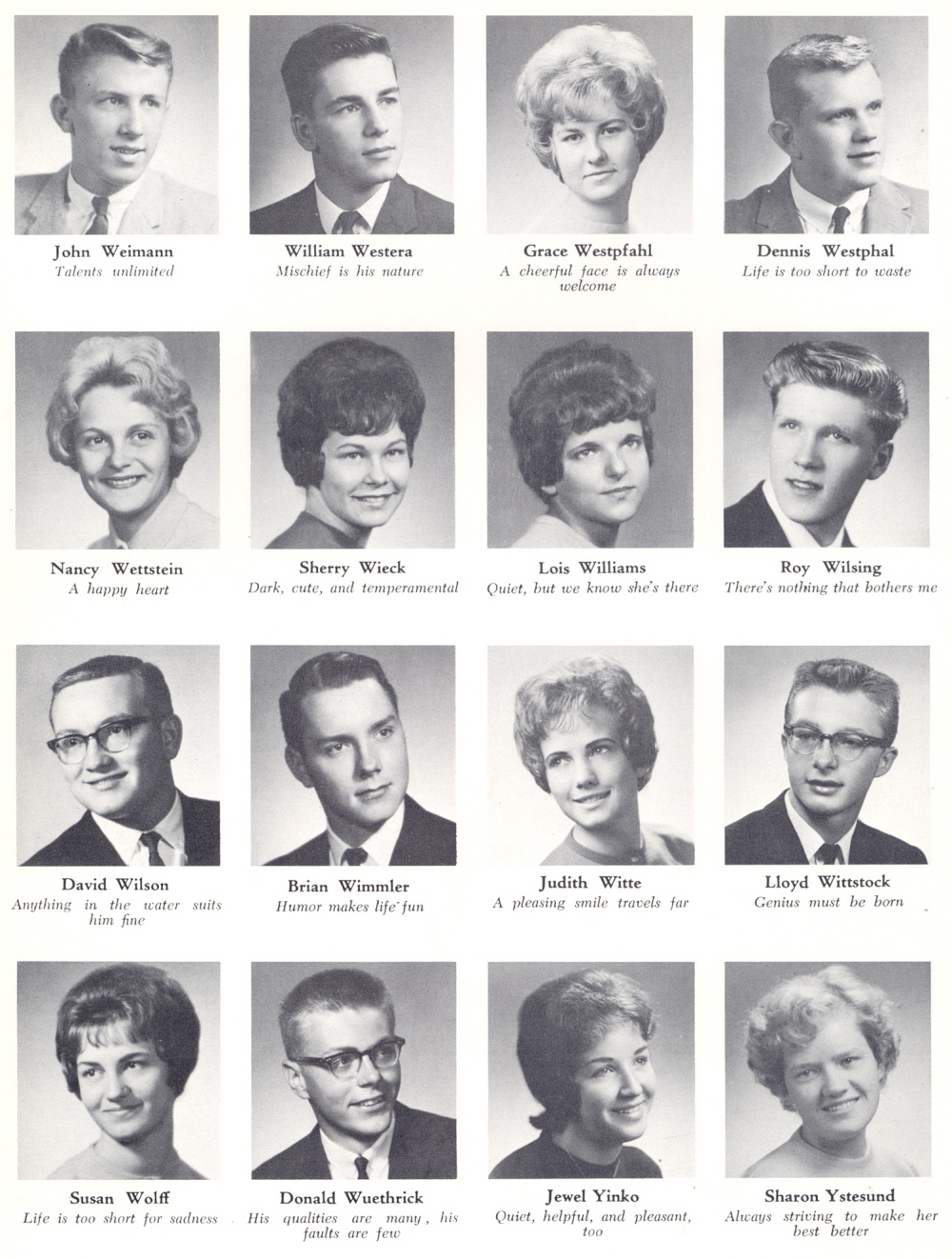 1963 Sheboygan South High School, Page 44: John Weimann, William Westera, Grace Westpfahl, Dennis Westphal, Nancy Wettstein, Sherry Wieck, Lois Williams, Roy Wilsing, David Wilson, Brian Wimmler, Judith Witte, Lloyd Wittstock, Susan Wolff, Donald Wuethrick, Jewel Yinko, Sharon Ystesund.