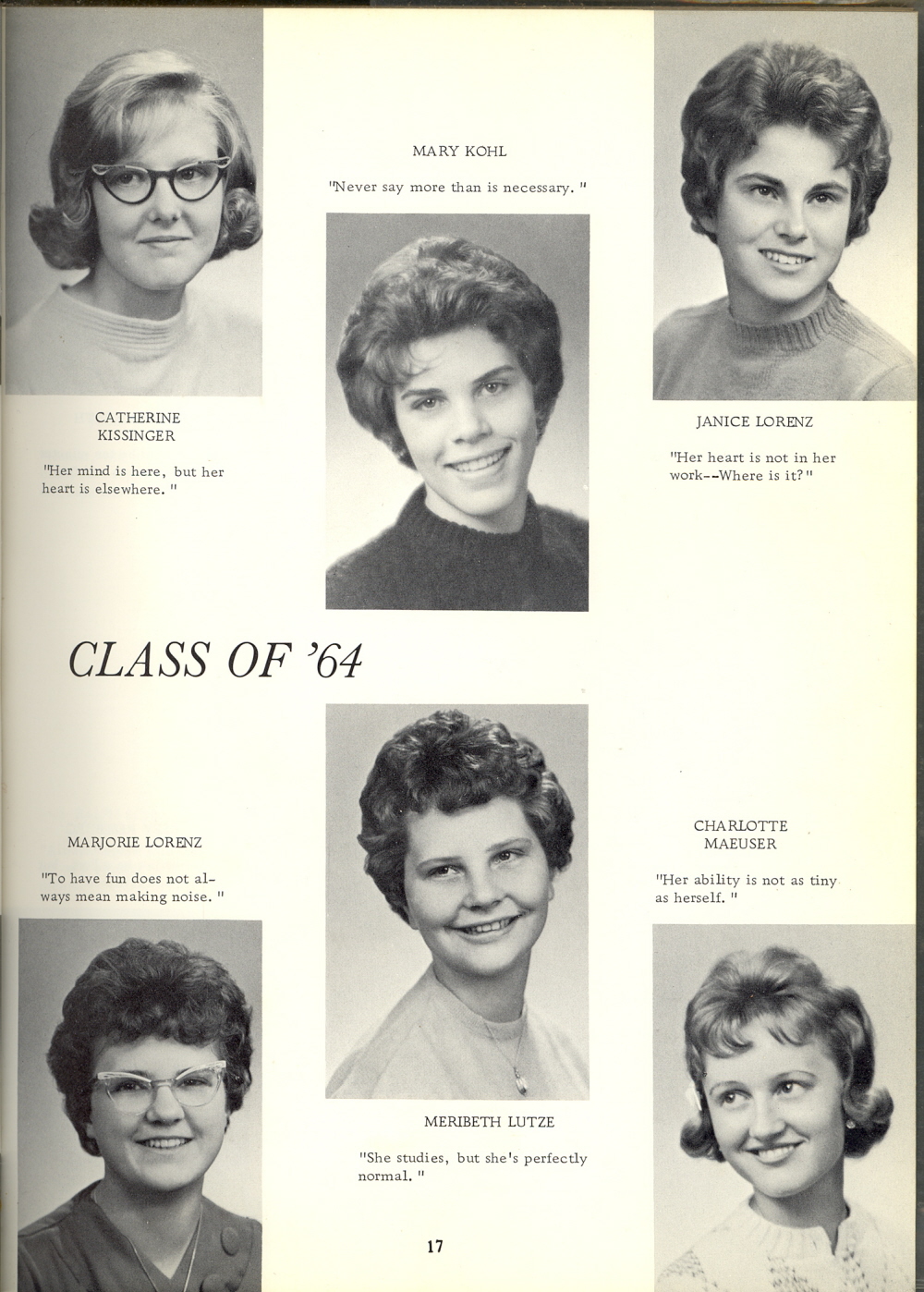 1964 Howards Grove High School, Page 17: Catherine Kissinger, Mary Kohl, Janice Lorenz, Marjorie Lorenz, Meribeth Lutze, Charlotte Maeuser.