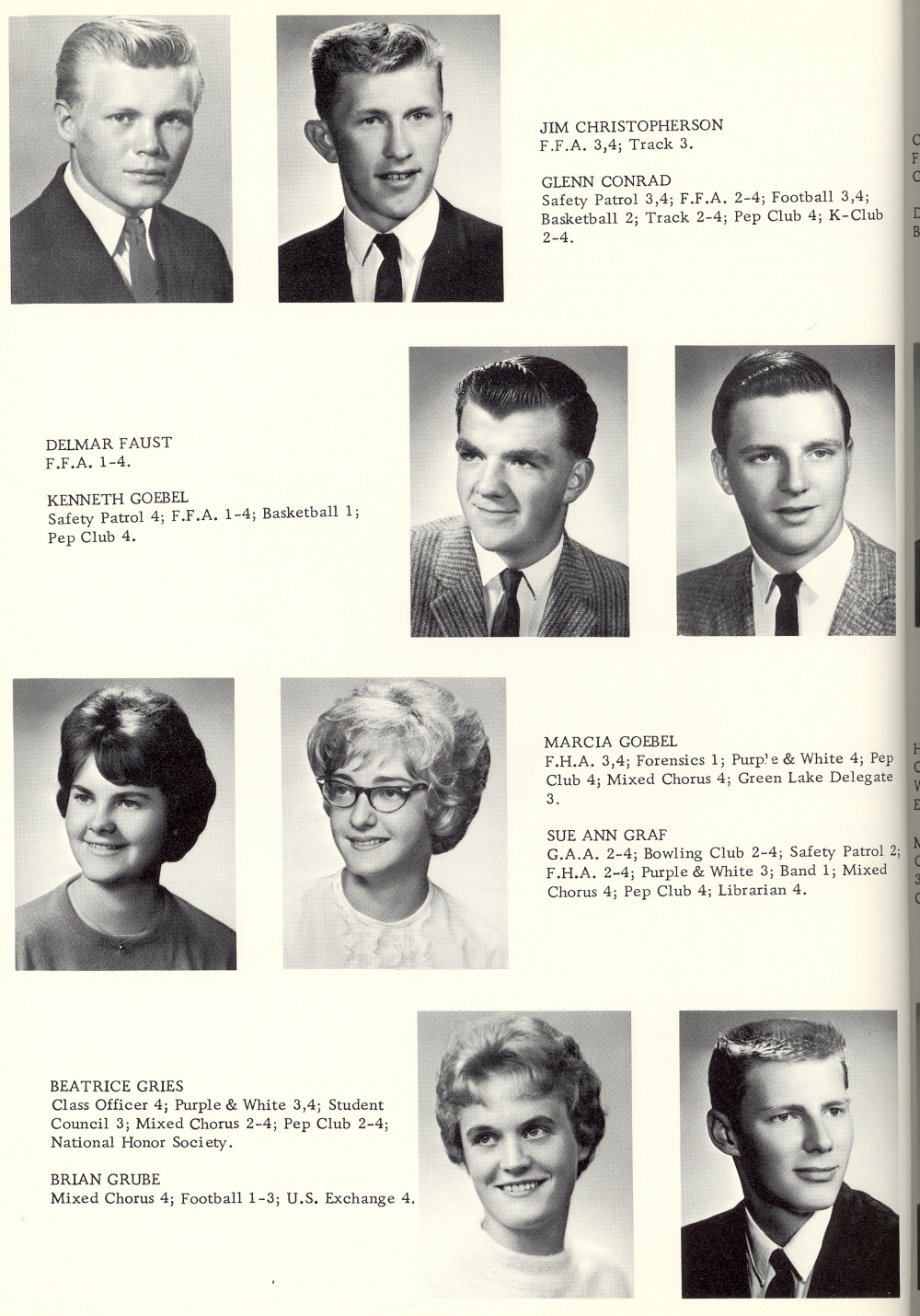 1964 Kiel High School, Page 2: Jim Christopherson, Glenn Conrad, Delmar Faust, Kenneth Goebel, Marcia Goebel, Sue Ann Graf, Beatrice Gries, Brian Grube.